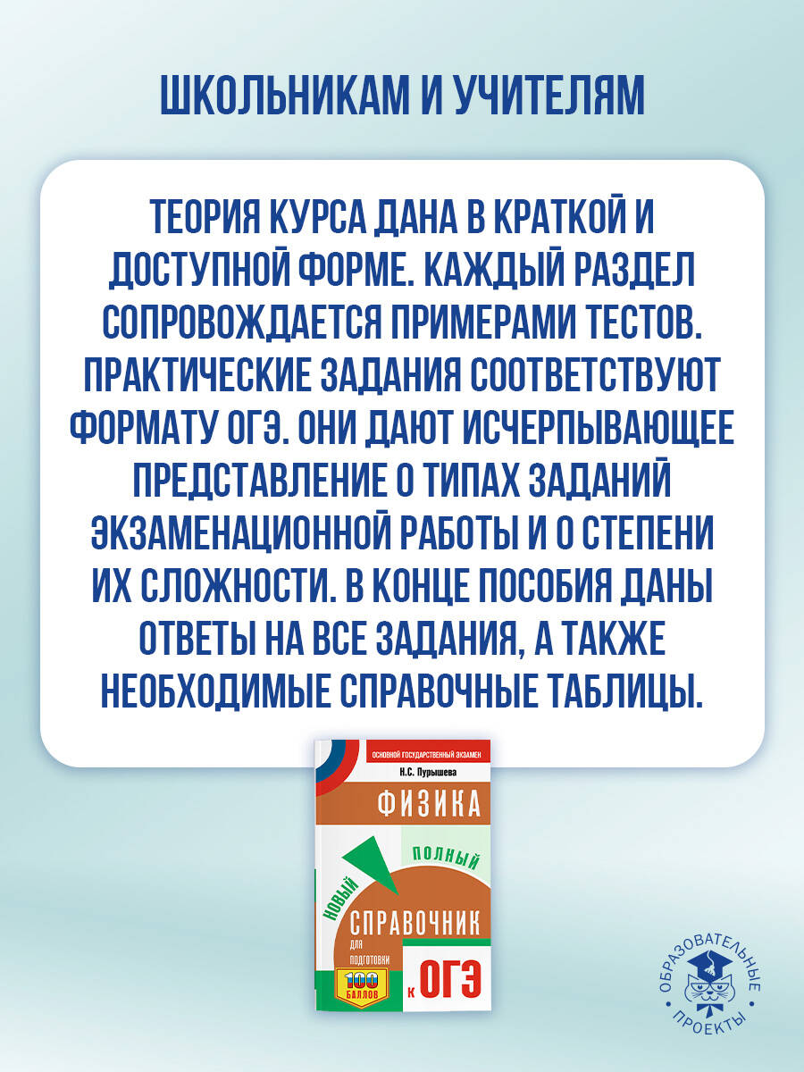 Данный справочник содержит весь теоретический материал по курсу физики, необходимый для сдачи основного государственного экзамена в 9 классе. Он включает в себя все элементы содержания, проверяемые контрольными и измерительными материалами, и помогает обобщить и систематизировать знания и умения за курс основной школы. Теория курса дана в краткой и доступной форме. Каждый раздел сопровождается примерами тестов. Практические задания соответствуют формату ОГЭ. Они дают исчерпывающее представление о типах заданий экзаменационной работы и о степени их сложности. В конце пособия даны ответы на все задания, а также необходимые справочные таблицы. Пособие может быть использовано учащимися для подготовки к ОГЭ и самоконтроля, а учителями - для подготовки учащихся основной школы к итоговой аттестации по физике.| Издательство | Издательство "АСТ" |
