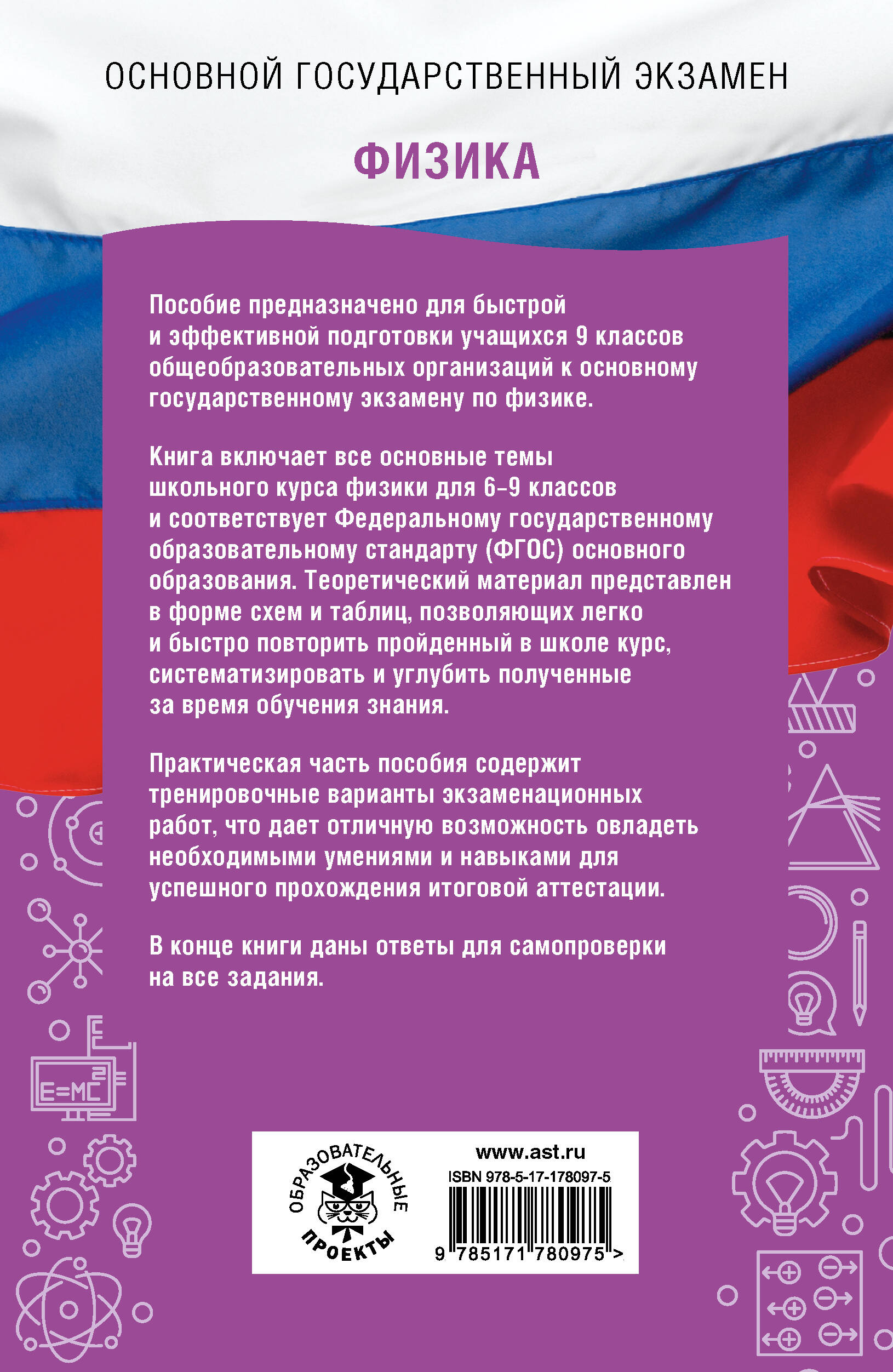 Пособие предназначено для быстрой и эффективной подготовки учащихся 9 классов общеобразовательных организаций к основному государственному экзамену по физике. Книга включает все основные темы школьного курса физики для 6 - 9 классов и соответствует Федеральному государственному образовательному стандарту (ФГОС) основного образования. Теоретический материал представлен в форме схем и таблиц, позволяющих легко и быстро повторить пройденный в школе курс, систематизировать и углубить полученные за время обучения знания. Практическая часть пособия содержит тренировочные варианты экзаменационных работ, что дает отличную возможность овладеть необходимыми умениями и навыками для успешного прохождения итоговой аттестации. В конце книги даны ответы для самопроверки на все задания.| Издательство | Издательство "АСТ" |
