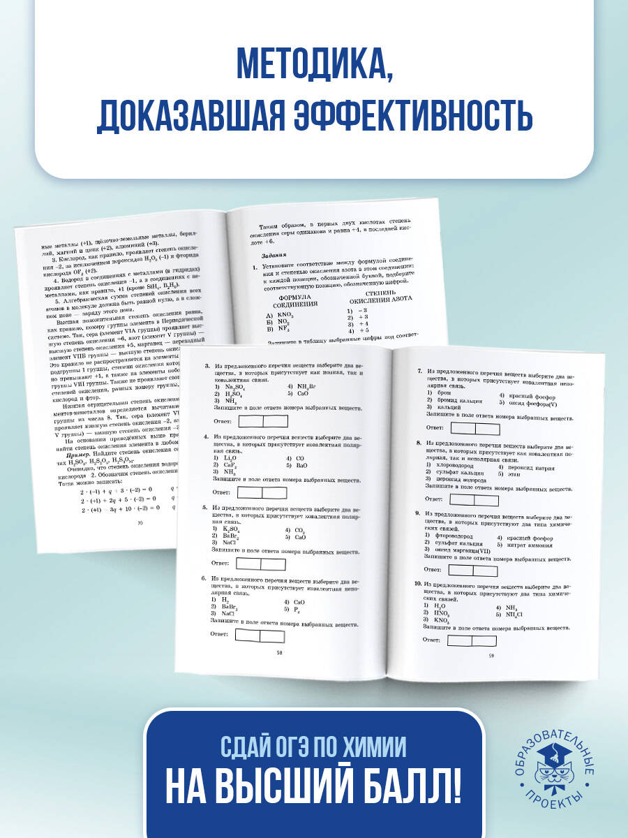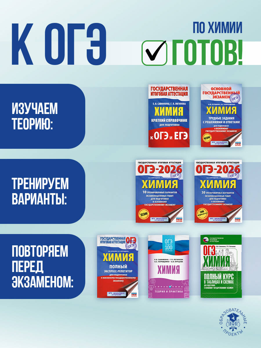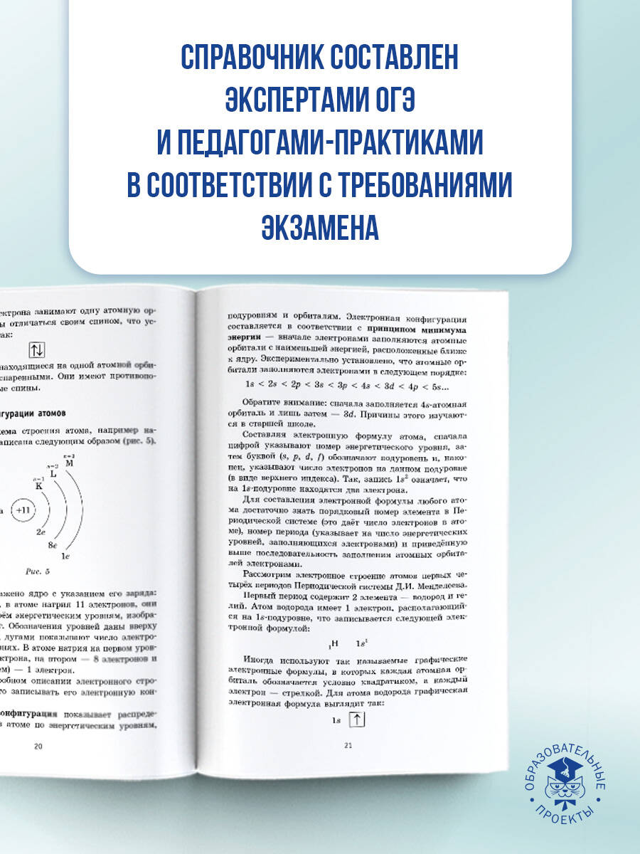 Справочник содержит теоретический материал по курсу химии и тестовые задания, необходимые для подготовки к Государственной итоговой аттестации (ОГЭ) выпускников 9-х классов общеобразовательных учреждений. Теория курса дана в краткой и доступной форме. Каждый раздел сопровождается примерами тестов. Они дают исчерпывающее представление о типах заданий экзаменационной работы и о степени их сложности. В конце пособия даны ответы на все задания, а также необходимые справочные таблицы. Пособие может быть использовано учащимися для подготовки к ОГЭ и самоконтроля, а учителями - для подготовки учащихся основной школы к итоговой аттестации по химии. Книга адресована учащимся, учителям и методистам.| Издательство | Издательство "АСТ" |