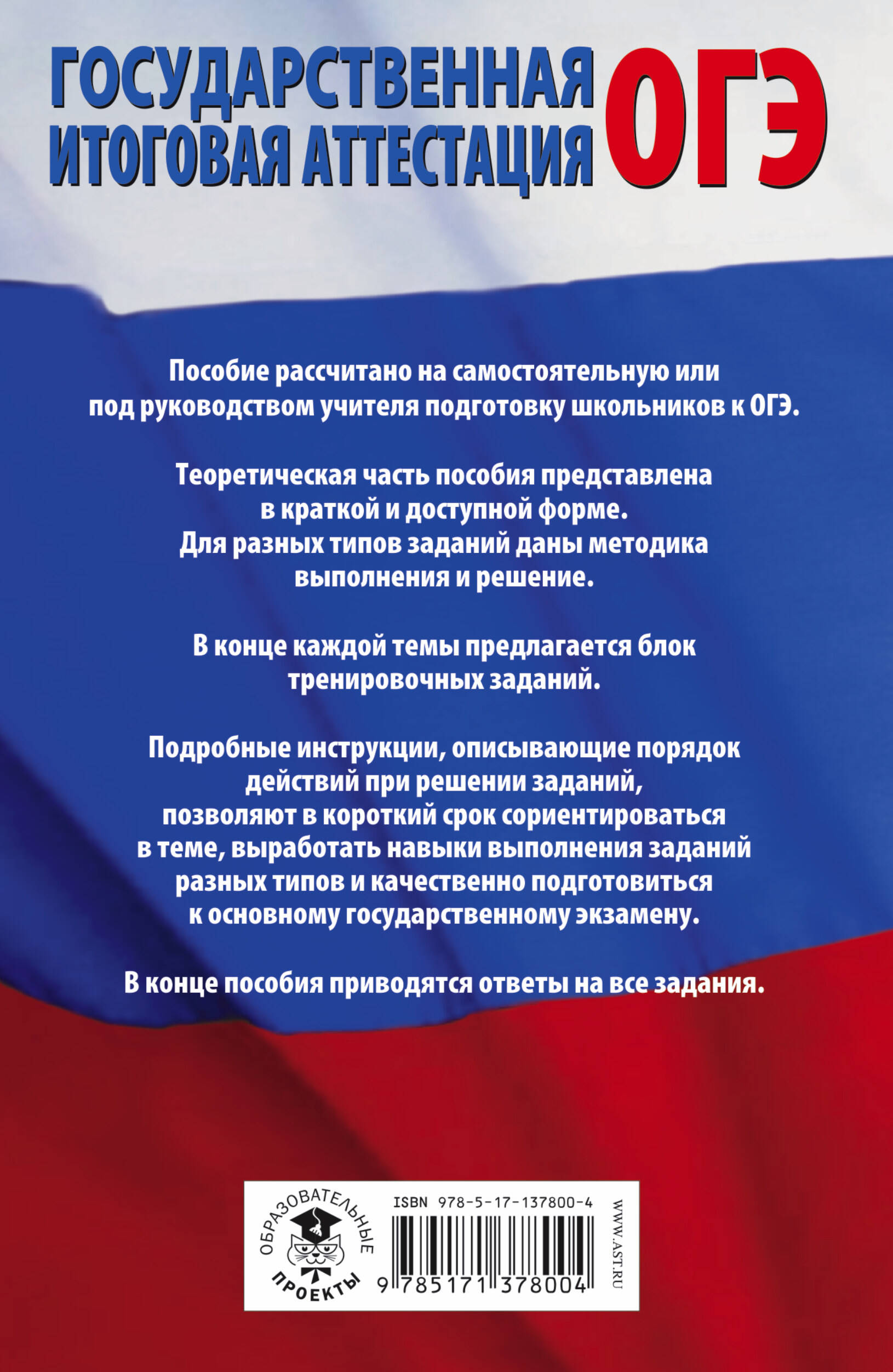 Пособие рассчитано на самостоятельную или под руководством учителя подготовку школьников к ОГЭ. Теоретическая часть пособия представлена в краткой и доступной форме. Для каждого типа заданий даны методика выполнения и решение. В конце каждой темы предлагается блок тренировочных заданий. Подробные инструкции, описывающие порядок действий при работе с каждым типом заданий, позволяют в короткий срок сориентироваться в теме, выработать навыки выполнения заданий разных типов и качественно подготовиться к основному государственному экзамену. В конце пособия приводятся ответы на все задания.| Издательство | ИЗДАТЕЛЬСТВО "АСТ" |