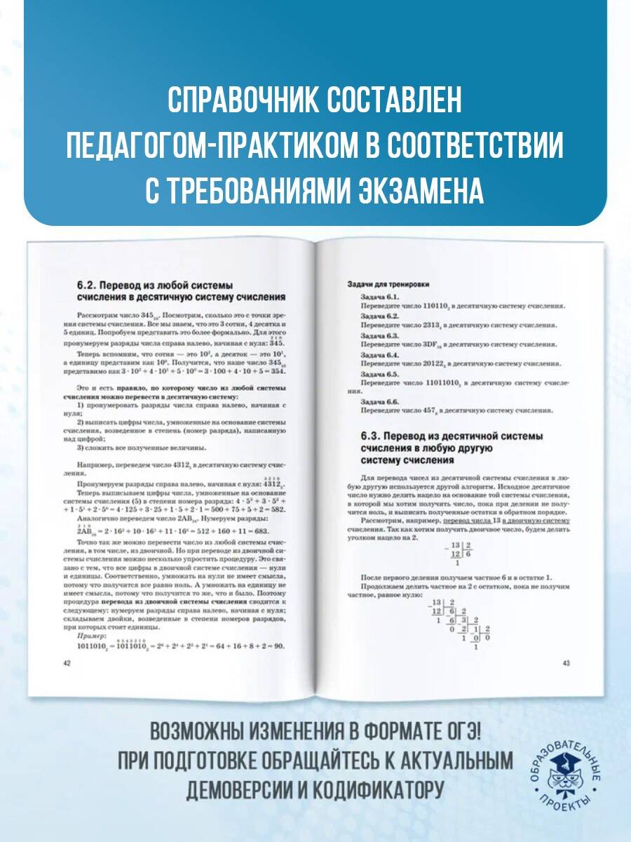 В справочнике представлен материал курса информатики в объёме, проверяемом на государственной итоговой аттестации. Структура справочника соответствует официальным требованиям к контрольным измерительным материалам (КИМ) для проведения ОГЭ. Материал сгруппирован по главам, в каждой из которых изучается определённая тема курса информатики и ИКТ, проверяемая на экзамене. Помимо теоретических сведений главы включают разбор экзаменационных заданий и задачи для самостоятельной тренировки с ответами и критериями оценки в конце пособия. Книга будет незаменимым помощником при подготовке к экзамену в формате ОГЭ, при изучении нового материала, повторении пройденных тем.| Издательство | Издательство "АСТ" |