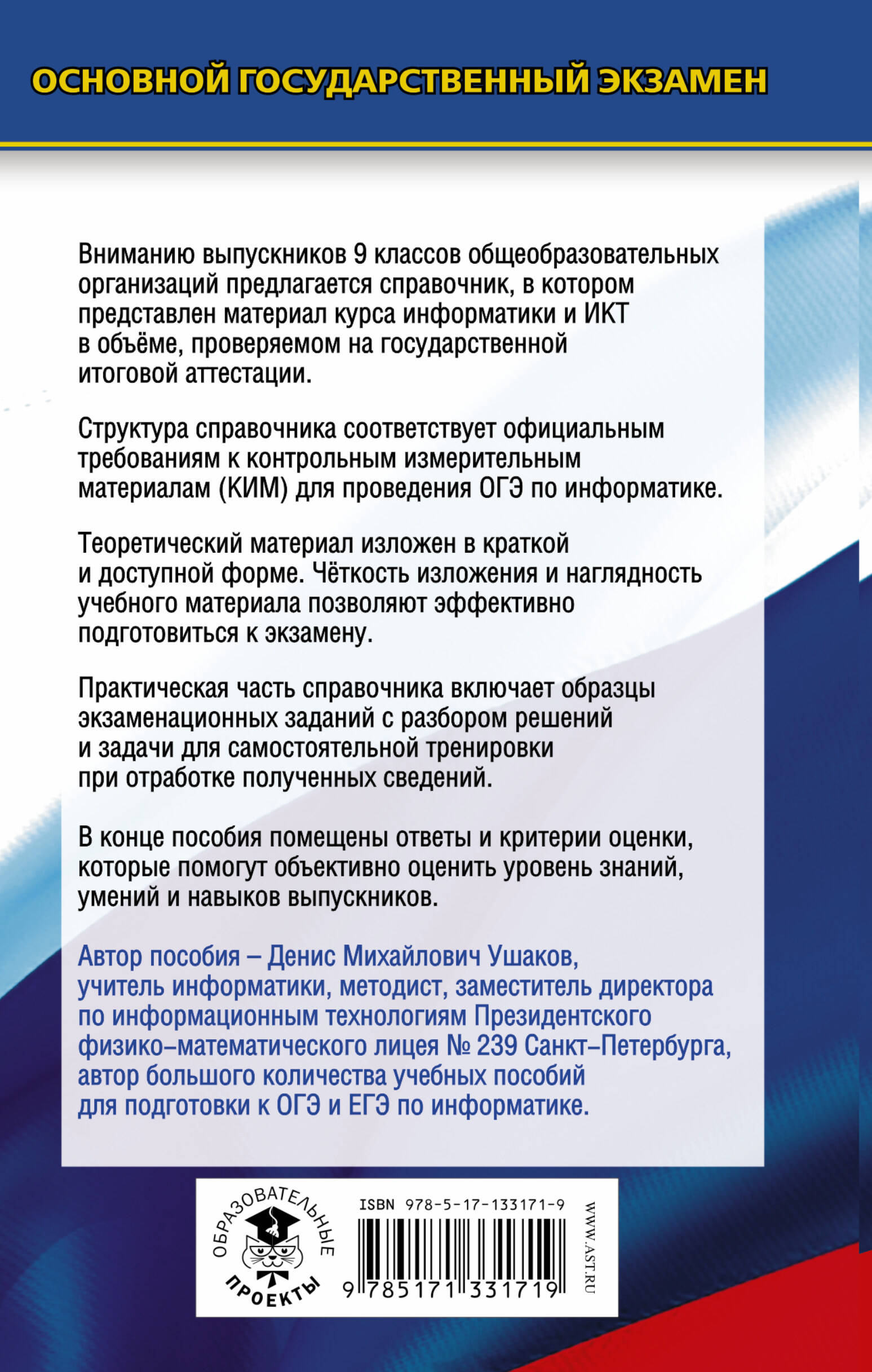 В справочнике представлен материал курса информатики в объёме, проверяемом на государственной итоговой аттестации. Структура справочника соответствует официальным требованиям к контрольным измерительным материалам (КИМ) для проведения ОГЭ. Материал сгруппирован по главам, в каждой из которых изучается определённая тема курса информатики и ИКТ, проверяемая на экзамене. Помимо теоретических сведений главы включают разбор экзаменационных заданий и задачи для самостоятельной тренировки с ответами и критериями оценки в конце пособия. Книга будет незаменимым помощником при подготовке к экзамену в формате ОГЭ, при изучении нового материала, повторении пройденных тем.| Издательство | Издательство "АСТ" |