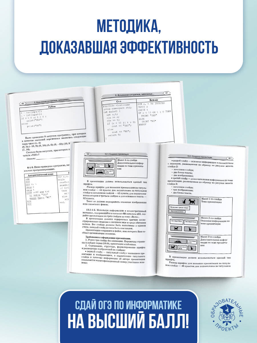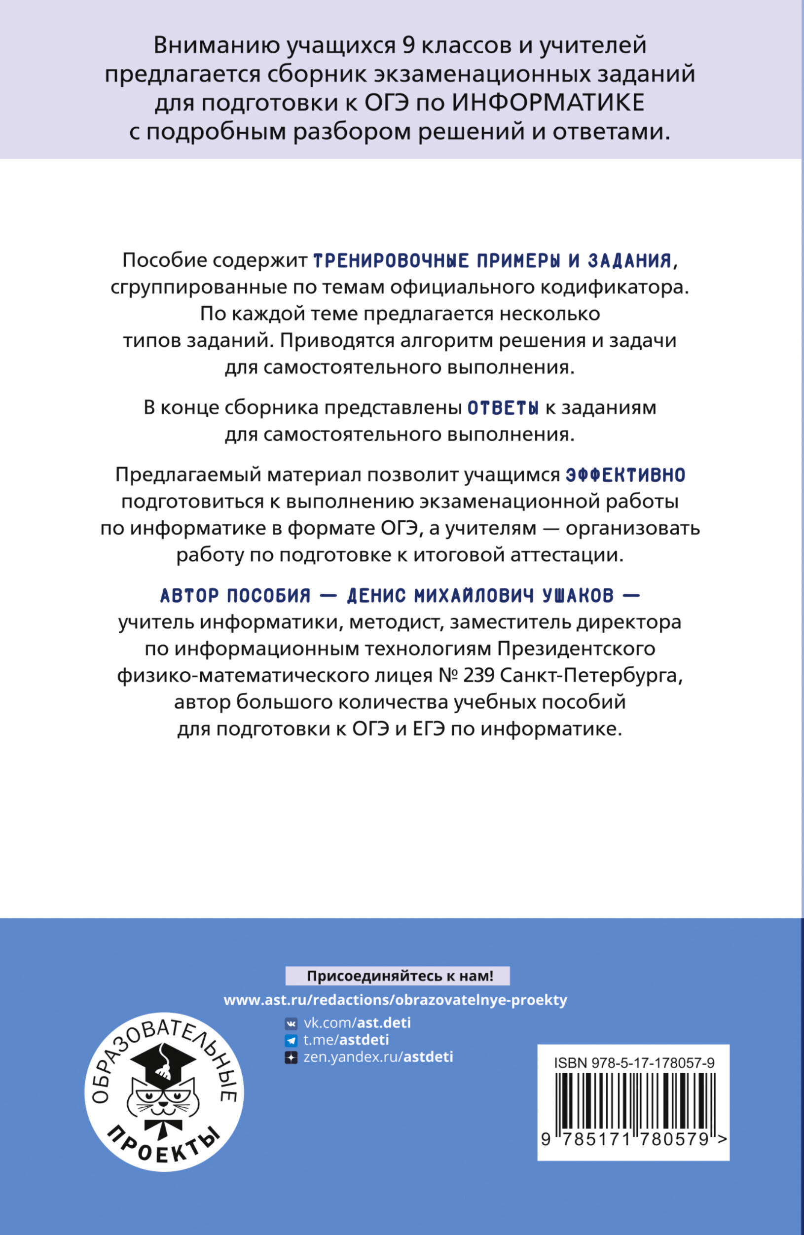 Вниманию выпускников 9-х классов предлагается сборник, который содержит тренировочные задания с подробным разбором решений и ответами по информатике и ИКТ для подготовки к ОГЭ. Задания в сборнике сгруппированы по темам, соответствующим спецификации общегосударственного экзамена. По каждой теме предлагается решить несколько типов задач, составленных исходя из примеров задач, предлагаемых на экзамене за последние несколько лет. На каждый тип представлен подробный разбор решения заданий и несколько заданий на самостоятельную отработку. В конце пособия даны ответы и критерии оценки к заданиям с развёрнутыми ответами. Предлагаемый материал позволит учителям организовать успешную подготовку к итоговой аттестации, а учащимся - самостоятельно проверить свои знания и готовность к выполнению экзаменационной работы по информатике в формате ОГЭ.| Издательство | Издательство "АСТ" |