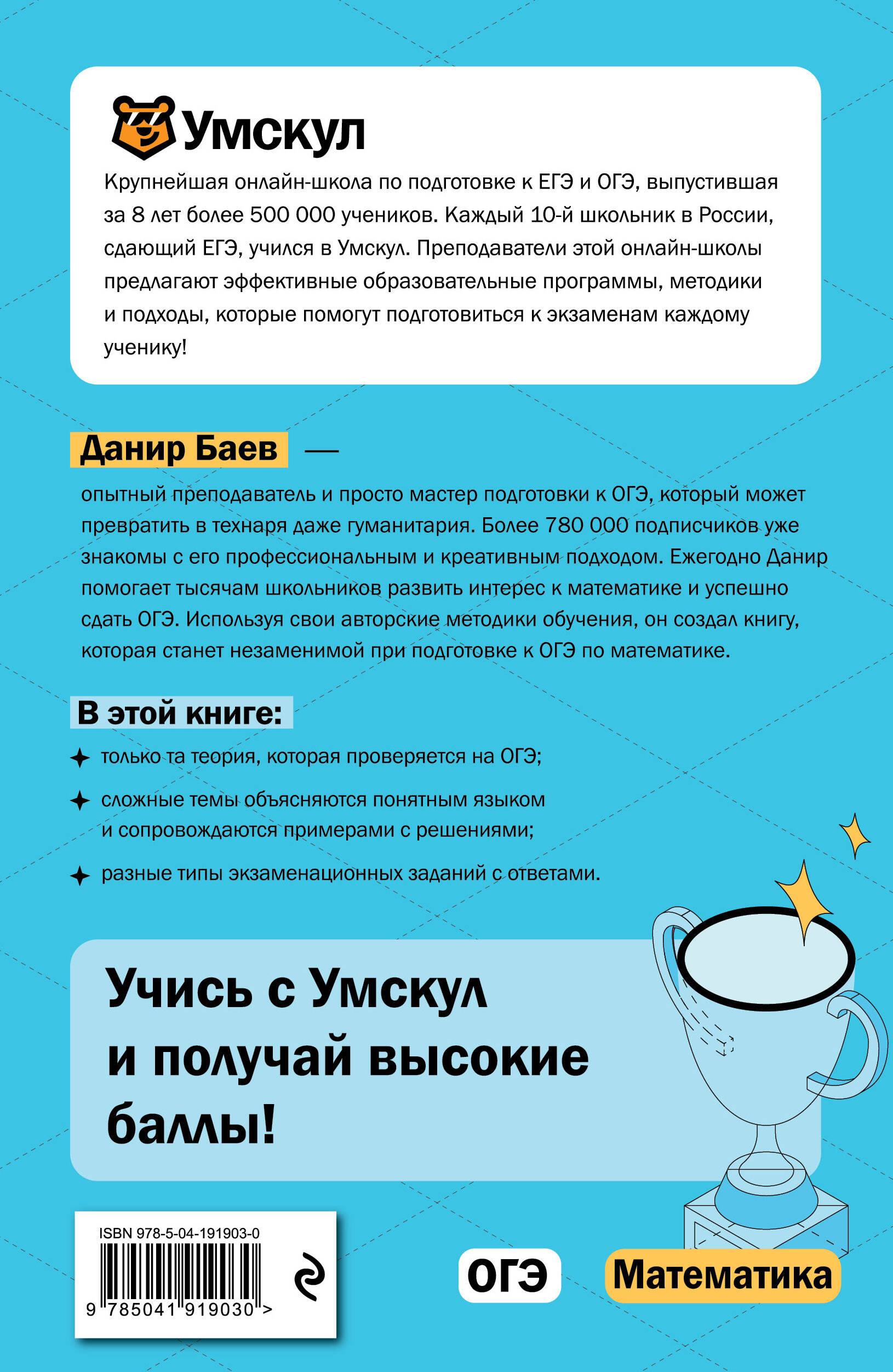 Эксклюзивный справочник от издательства «Эксмо» и топовой онлайн-школы «Умскул», выпустившей за 8 лет более 500 000 учеников, поможет каждому прийти к заветным баллам на ОГЭ 2025 по математике. В нём только самая актуальная и нужная для экзамена теория, а также разбор разных типов экзаменационных заданий! Автор пособия Данир Баев - опытный преподаватель, который может превратить в технаря даже гуманитария! В социальных сетях за ним следят более 780 000 подписчиков! Эта книга разложит по полочкам все темы по предмету за 5-9 классы: вы сможете запросто повторить уже изученный материал, а также проработать не охваченные ранее вопросы. Информация по разделам «Корни, степени, формулы сокращённого умножения», «Неравенства. Логические утверждения», «Уравнения», «Решение текстовых задач», «Теория вероятностей», «Арифметическая и геометрическая прогрессии», «Графики», «Окружность», «Площади фигур. Треугольники» и «Четырёхугольники» преподносится наглядно и понятно, а также сопровождается примерами. Вместе с теорией приводятся разные типы экзаменационных заданий с подробными решениями. Так ни одна важная мысль не ускользнёт от вас во время занятий! Присоединяйся к числу счастливчиков, с лёгкостью преодолевших экзамен благодаря «Умскул»!| Издательство | ООО "Издательство "Эксмо" |