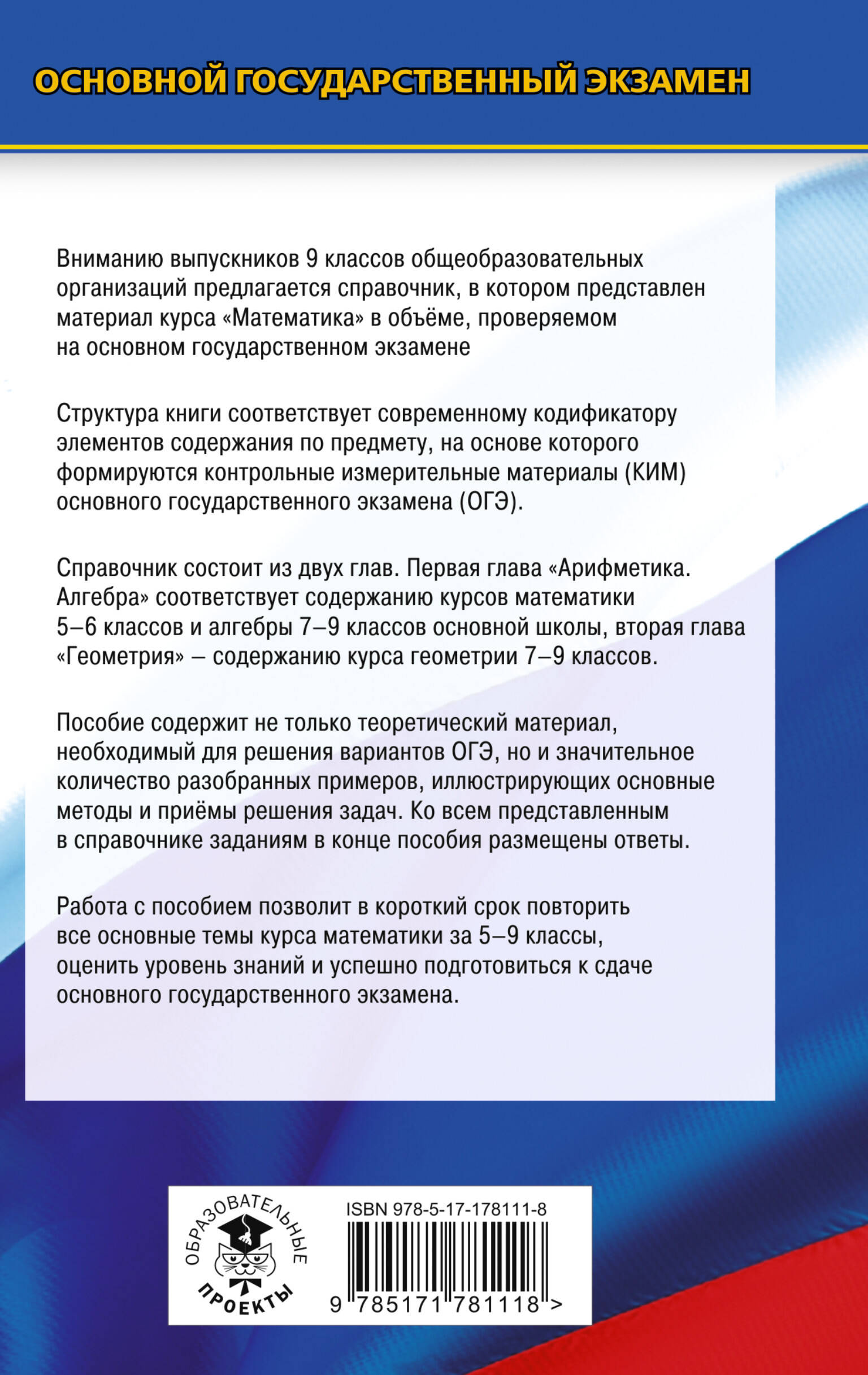 Cправочник содержит материал курса "Математика" в объёме, проверяемом на государственной итоговой аттестации. Структура книги соответствует современному кодификатору элементов содержания по предмету, на основе которого формируются контрольные измерительные материалы (КИМы) основного государственного экзамена (ОГЭ). Справочник состоит из двух глав. Первая глава "Арифметика. Алгебра" соответствует содержанию курсов математики 5-6 классов и алгебры 7-9 классов основной школы, вторая глава "Геометрия" - содержанию курса геометрии 7-9 классов. Помимо теоретического материала в справочнике представлено значительное количество разобранных примеров, иллюстрирующих основные методы и приёмы решения задач. Ко всем заданиям в конце пособия даны ответы для самопроверки. Работа с пособием позволит повторить все основные темы курса математики за 5-9 классы и успешно подготовиться к сдаче ОГЭ. Справочник адресован выпускникам 9-х классов.| Издательство | Издательство "АСТ" |