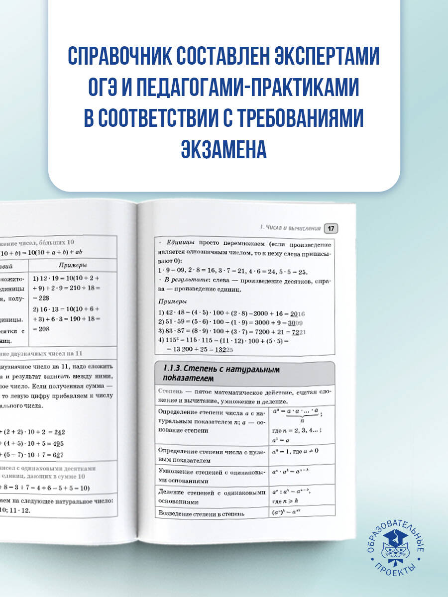 Пособие содержит материал курса "Математика" в объёме, проверяемом на основном государственном экзамене. Структура книги соответствует современному кодификатору элементов содержания по предмету, на основе которого формируются экзаменационные задания. Справочник состоит из двух глав. Первая глава "Алгебра" соответствует содержанию курсов математики 5-6 классов, алгебры 7-9 классов; вторая глава "Геометрия" - содержанию курса планиметрии 7-9 классов. Наглядность и доступность подачи материала в табличной форме позволяет легко и быстро обощить, систематизировать и повторить материал школьного курса математики за 5-9 классы и успешно подготовиться к сдаче ОГЭ.| Издательство | Издательство "АСТ" |