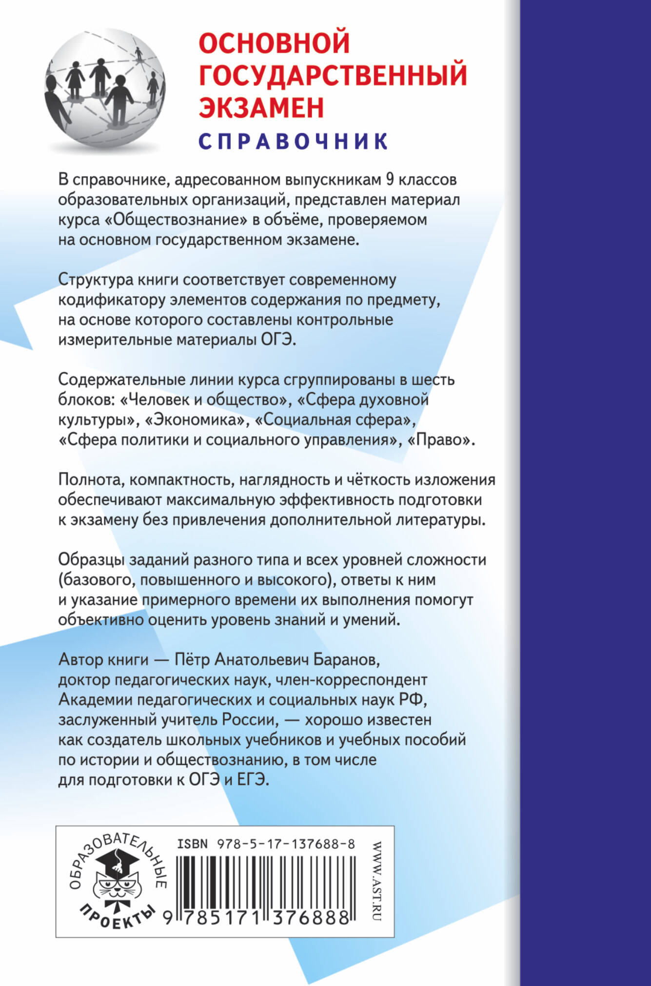 В справочнике, адресованном выпускникам 9 классов общеобразовательных учреждений, представлен материал курса «Обществознание» в объёме, проверяемом наосновном государственном экзамене. Структура книги соответствует современному кодификатору элементов содержания по предмету, на основе которого составлены контрольные измерительные материалы ОГЭ. Содержательные линии курса сгруппированы в шесть блоков-модулей: «Человек и общество», «Сфера духовной культуры», «Экономика», «Социальная сфера», «Сфера политики и социального управления», «Право». Полнота, компактность, наглядность и чёткость изложения обеспечивают максимальную эффективность подготовки к экзамену. Образцы заданий разного типа (А,В,С) и всех уровней сложности (базового, повышенного и высокого), ответы к ним и указание примерного времени их выполнения помогут объективно оценить уровень знаний и умений.| Издательство | АСТ |