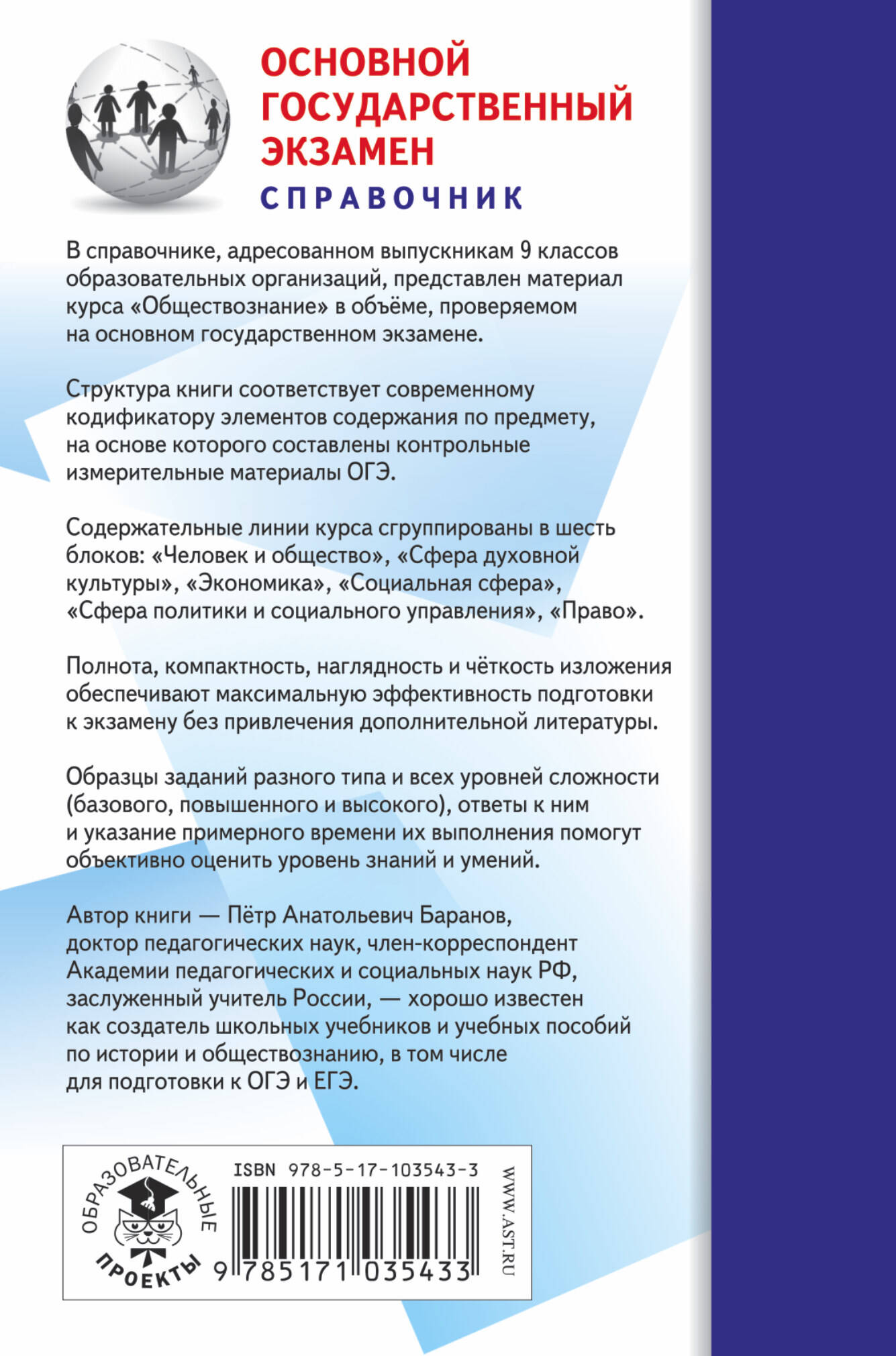 В справочнике, адресованном выпускникам 9 классов общеобразовательных учреждений, представлен материал курса «Обществознание» в объёме, проверяемом наосновном государственном экзамене. Структура книги соответствует современному кодификатору элементов содержания по предмету, на основе которого составлены контрольные измерительные материалы ОГЭ. Содержательные линии курса сгруппированы в шесть блоков-модулей: «Человек и общество», «Сфера духовной культуры», «Экономика», «Социальная сфера», «Сфера политики и социального управления», «Право». Полнота, компактность, наглядность и чёткость изложения обеспечивают максимальную эффективность подготовки к экзамену. Образцы заданий разного типа (А,В,С) и всех уровней сложности (базового, повышенного и высокого), ответы к ним и указание примерного времени их выполнения помогут объективно оценить уровень знаний и умений.| Издательство | Издательство "АСТ" |