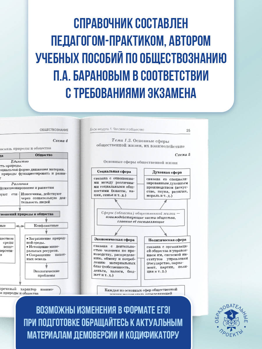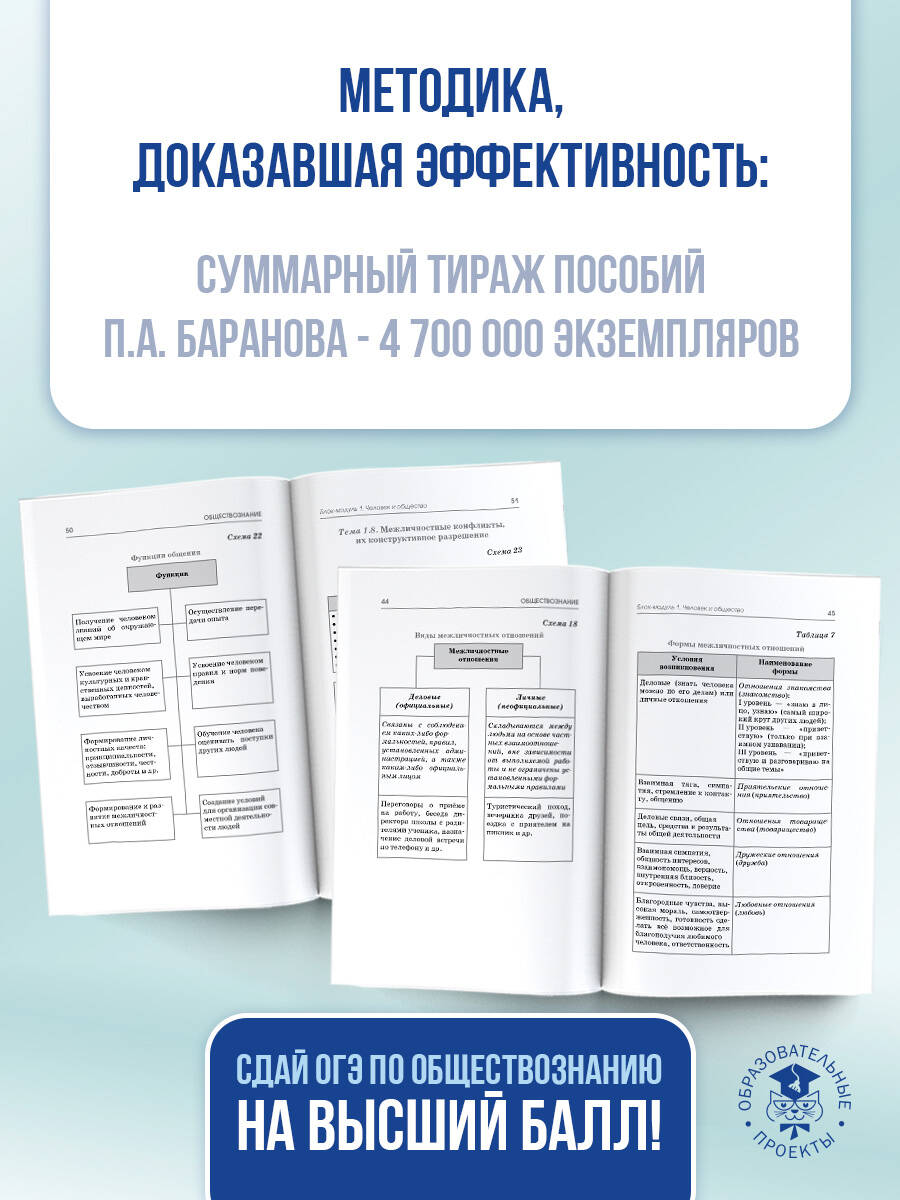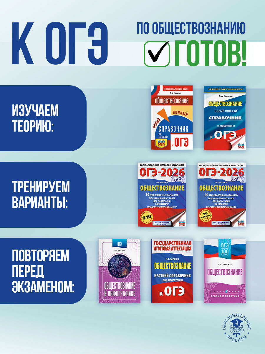 Вниманию выпускников 9 классов образовательных организаций предлагается пособие, в котором представлен материал курса обществознания в объеме, проверяемом на основном государственном экзамене. Структура и книги соответствуют современному кодификатору элементов содержания по предмету, на основе которого составлены контрольные измерительные материалы (КИМ) ОГЭ. Пособие включает разделы: "Человек и общество", "Сфера духовной культуры", "Экономика", "Социальная сфера", "Сфера политики и социального управления", "Право". Полнота, компактность, наглядность и четкость изложения - в виде таблиц и схем - обеспечивает максимальную эффективность подготовки к экзамену без привлечения дополнительной литературы. Автор книги - Пётр Анатольевич Баранов, доктор педагогических наук, член-корреспондент Академии педагогических и социальных наук РФ, заслуженный учитель России, - хорошо известен как создатель школьных учебников и учебных пособий по обществознанию и истории, в том числе и для подготовки к ОГЭ и ЕГЭ.| Издательство | Издательство "АСТ" |
