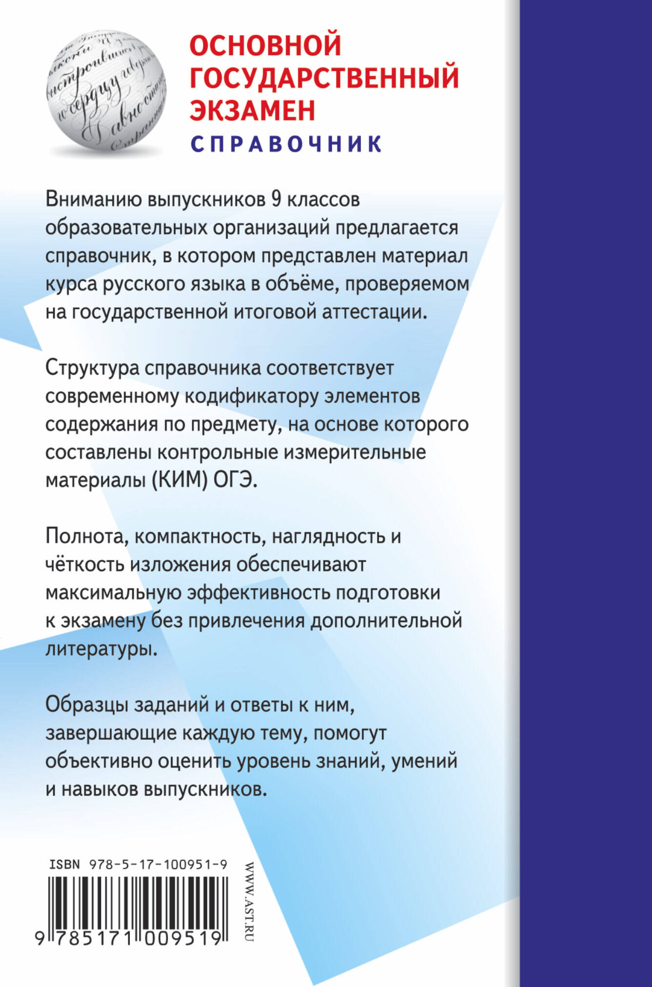 Справочник предназначен для подготовки учащихся 9 классов к основному государственному экзамену по русскому языку. Книга содержит теоретический материал по всему школьному курсу русского языка, рекомендации для написания сочинения, обобщающий текст с комментариями. Практическая часть включает образцы тестовых заданий, приближённых по объёму, структуре и отобранному материалу к контрольным измерительным материалам для проведения ОГЭ. В конце пособия приведены ответы к тестовым заданиям.| Издательство | Издательство "АСТ" |