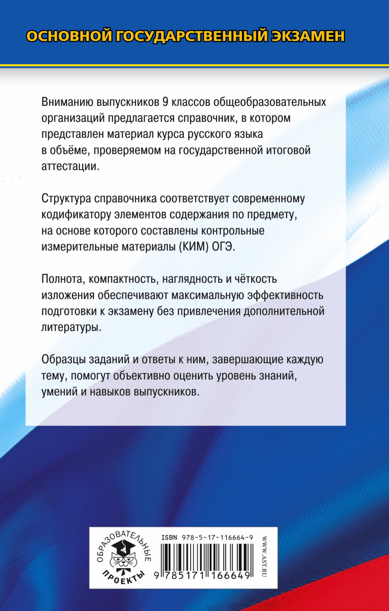 Справочник предназначен для подготовки учащихся 9 классов к основному государственному экзамену по русскому языку. Книга содержит теоретический материал по всему школьному курсу русского языка, рекомендации для написания сочинения, обобщающий текст с комментариями. Практическая часть включает образцы тестовых заданий, приближённых по объёму, структуре и отобранному материалу к контрольным измерительным материалам для проведения ОГЭ. В конце пособия приведены ответы к тестовым заданиям.| Издательство | Издательство "АСТ" |