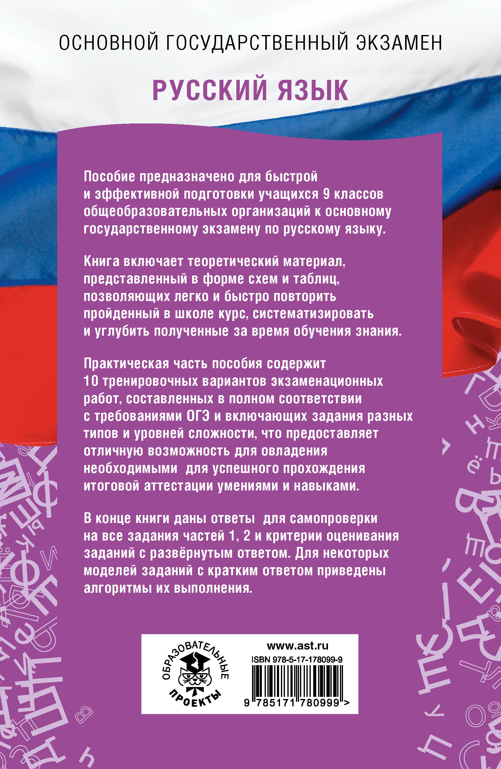 Пособие предназначено для быстрой и эффективной подготовки учащихся 9 классов классов общеобразовательных организаций к основному государственному экзамену по русскому языку. Книга включает теоретический материал, представленный в форме схем и таблиц, позволяющих легко и быстро повторить пройденный в школе курс, систематизировать и углубить полученные за время обучения знания. Практическая часть пособия содержит 10 тренировочных вариантов экзаменационных работ, составленных в полном соответствии с требованиями ОГЭ и включающих задания разных типов и уровней сложности, что предоставляет отличную возможность для овладения необходимыми для успешного прохождения итоговой аттестации умениями и навыками. В конце книги даны ответы для самопроверки на все задания частей 1, 2 и критерии оценивания заданий с развёрнутым ответом. Для некоторых моделей заданий с кратким ответом приведены алгоритмы их выполнения.| Издательство | Издательство "АСТ" |