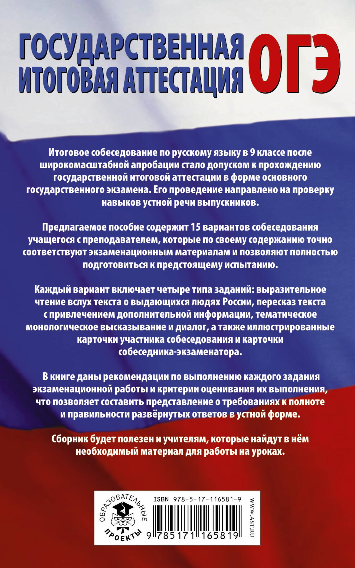Цель пособия - помочь учащимся 9 классов подготовиться к итоговому собеседованию, являющемуся допуском к основному государственному экзамену. Книга содержит 15 вариантов собеседования учащегося с преподавателем, которые по своему содержанию точно соответствуют экзаменационным материалам и позволяют полностью подготовиться к предстоящему испытанию. Каждый вариант включает четыре типа заданий: выразительное чтение вслух текста о выдающихся людях России, пересказ текста с привлечением дополнительной информации, тематическое монологическое высказывание и диалог, а также иллюстрированные карточки участника собеседования и карточки собеседника-экзаменатора. В книге даны рекомендации по выполнению каждого задания экзаменационной работы и критерии оценивания их выполнения, что позволяет составить представление о требованиях к полноте и правильности развёрнутых ответов в устной форме. Сборник будет полезен и учителям, которые найдут в нём необходимый материал для работы на уроках.| Издательство | Издательство "АСТ" |