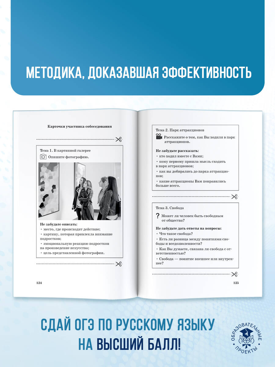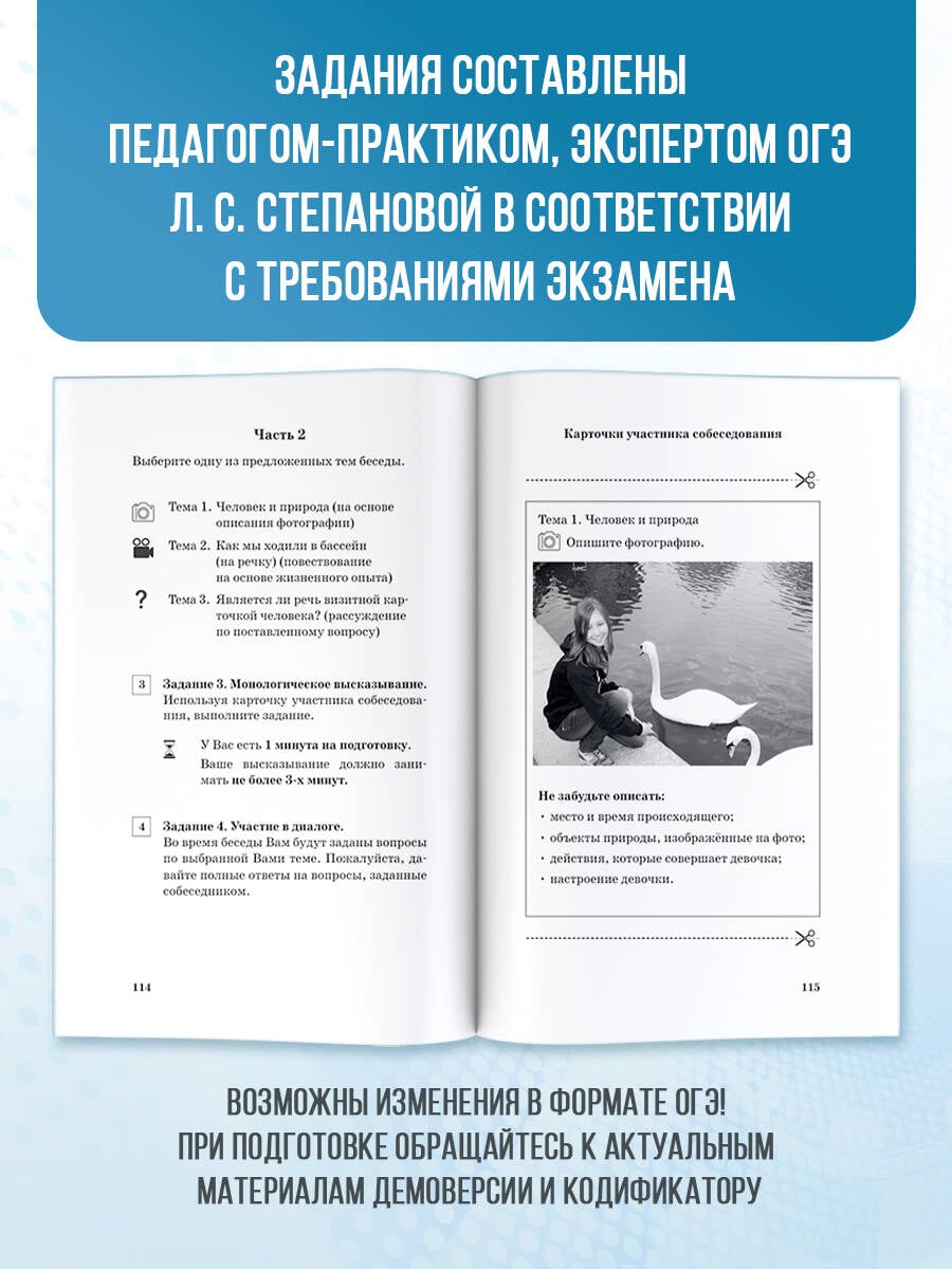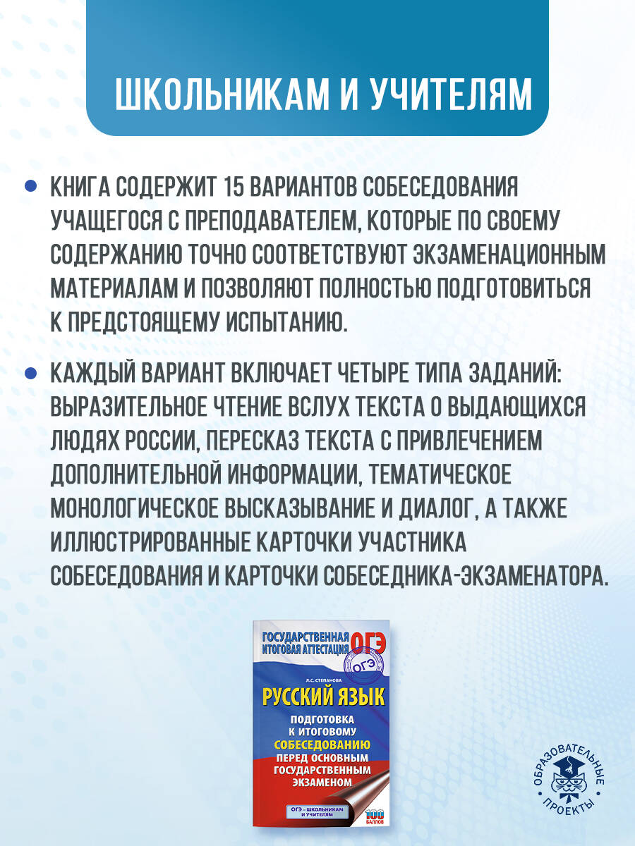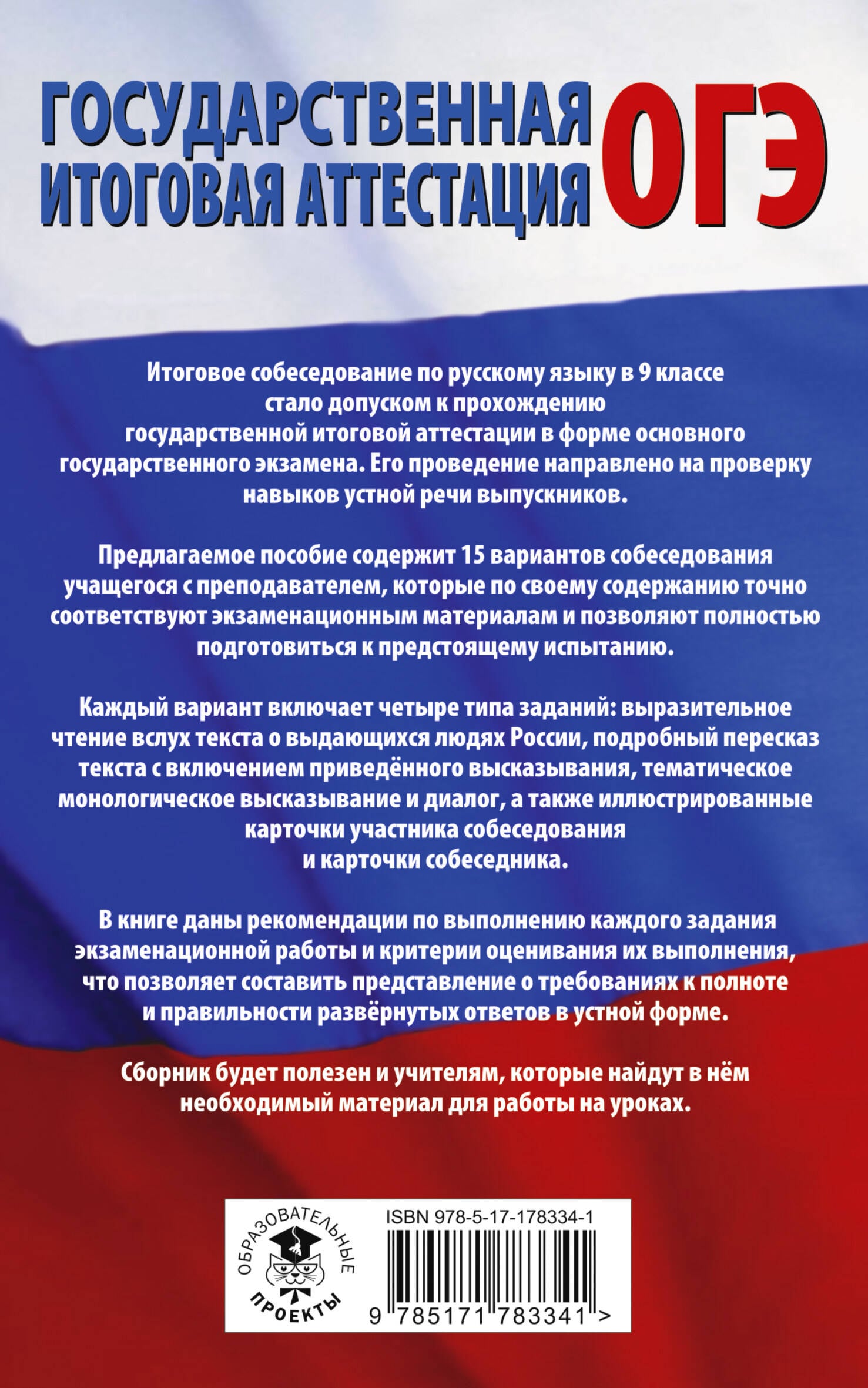 Цель пособия - помочь учащимся 9 классов подготовиться к итоговому собеседованию, являющемуся допуском к основному государственному экзамену. Книга содержит 15 вариантов собеседования учащегося с преподавателем, которые по своему содержанию точно соответствуют экзаменационным материалам и позволяют полностью подготовиться к предстоящему испытанию. Каждый вариант включает четыре типа заданий: выразительное чтение вслух текста о выдающихся людях России, пересказ текста с привлечением дополнительной информации, тематическое монологическое высказывание и диалог, а также иллюстрированные карточки участника собеседования и карточки собеседника-экзаменатора. В книге даны рекомендации по выполнению каждого задания экзаменационной работы и критерии оценивания их выполнения, что позволяет составить представление о требованиях к полноте и правильности развёрнутых ответов в устной форме. Сборник будет полезен и учителям, которые найдут в нём необходимый материал для работы на уроках.| Издательство | Издательство "АСТ" |