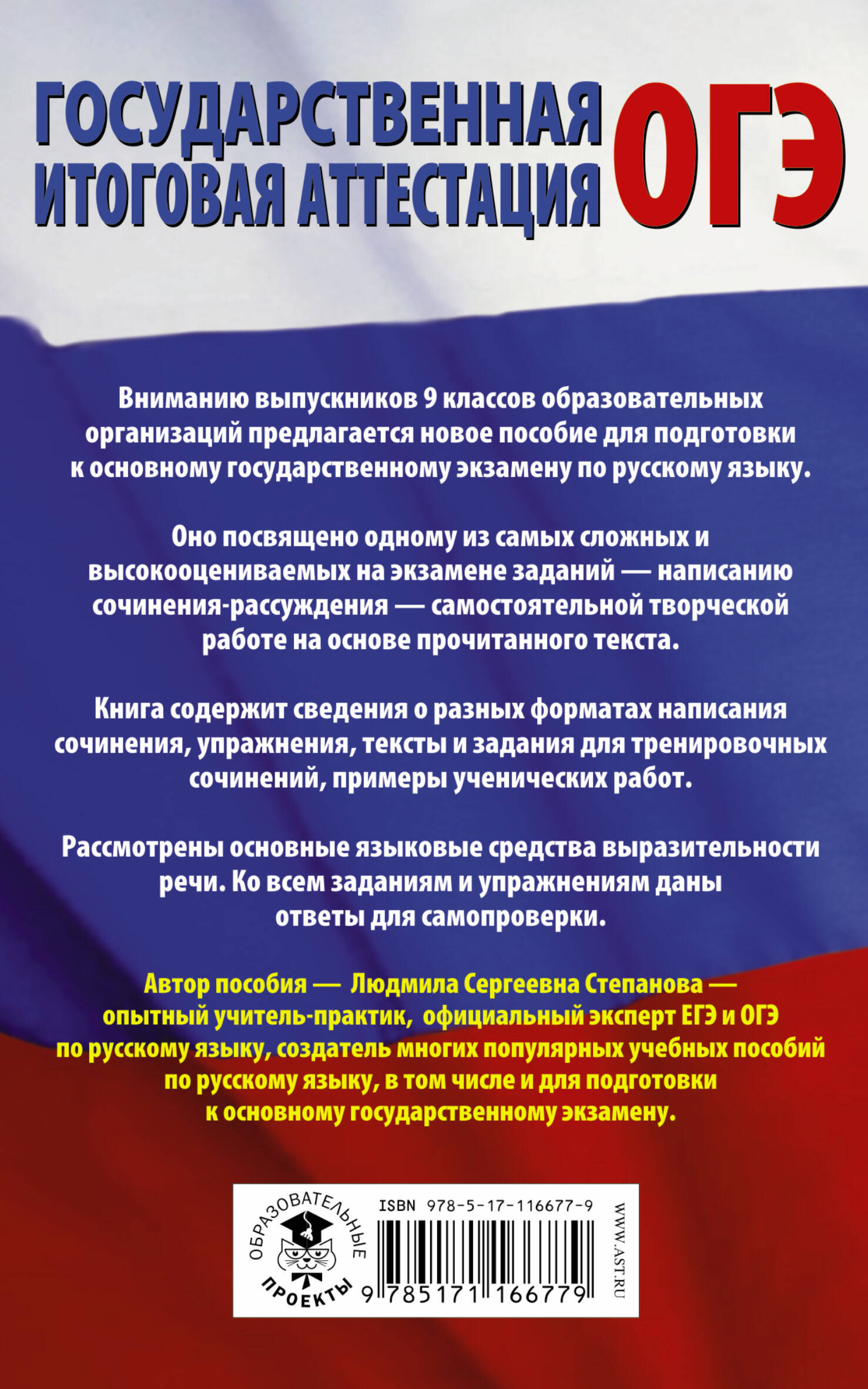 Вниманию выпускников 9 классов образовательных организаций предлагается новое пособие для подготовки к основному государственному экзамену по русскому языку. Оно посвящено одному из самых сложных и высокооцениваемых на экзамене заданий - написанию сочинения-рассуждения - самостоятельной творческой работе на основе прочитанного текста. Книга содержит сведения о разных форматах написания сочинения, упражнения, тексты и задания для тренировочных сочинений, примеры ученических работ. Рассмотрены основные языковые средства выразительности речи. Ко всем заданиям и упражнениям даны ответы для самопроверки.| Издательство | ИЗДАТЕЛЬСТВО "АСТ" |