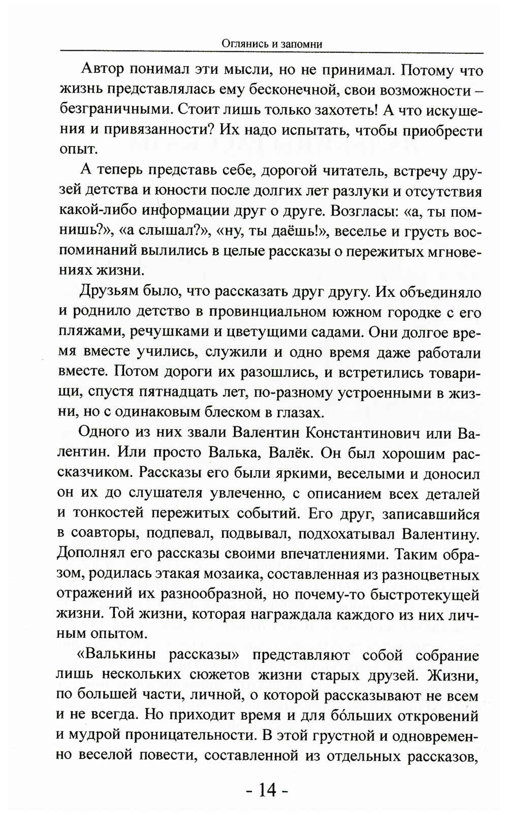 Автор никогда не считал себя ни писателем, ни поэтом, так как этим видом деятельности, по его мнению, люди должны заниматься профессионально, т. е. видеть в нём свой основной источник средств существования. У автора так по жизни не получалось, но он иногда находил время и возможности подмечать и записывать некоторые впечатления от быстротекущей жизни. Так и накопились представляемые записки. Сборник включает в себя ранее изданные "Валькины рассказы", "Сквозь чувства и годы", "Однажды в детстве", дополненные стихами, рассказами и другими произведениями, написанными в разные годы. Это и "Боевой листок", и "Неактуальные заметки", и ""Недостроенная ГЭС". Темы любви, светлой грусти о прожитом составляют содержание представленных произведений. Они перекликаются, дополняют друг друга и заставляют надеяться на их продолжение.