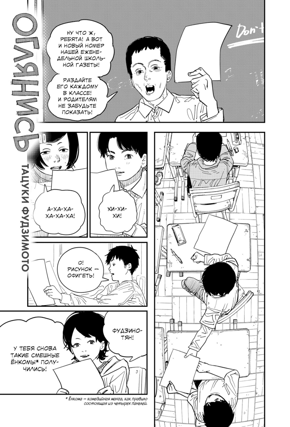 Путь мангаки тернист и непрост... Но именно на этот путь решают ступить две школьницы Фудзино и Кёмото. После внезапной и судьбоносной встречи девочки решают объединить усилия и подать свою работу в известный журнал манги. Впереди художниц ждут успех, признание и годы совместного творчества. Но выдержит ли их дружба испытания, которые готовит девочкам мир рисованных историй?.. «Оглянись» - одно из последних произведений Тацуки Фудзимото, автора таких популярных серий, как «Человек-бензопила» и «Огненный удар». Это пронзительная и невероятно лиричная история о мечтах, утратах и неудержимом стремлении к совершенству, в которой Фудзимото честно рассказывает о том, что ждет отважных мечтателей, решивших посвятить свою жизнь созданию манги.| Издательство | Азбука |