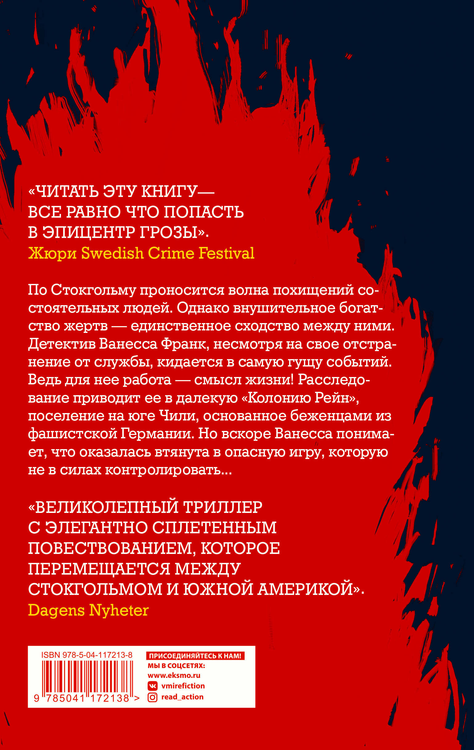 По Стокгольму проносится волна похищений состоятельных людей. Однако внушительное богатство жертв - единственное сходство между ними. Детектив Ванесса Франк, несмотря на свое отстранение от службы, кидается в самую гущу событий. Ведь для нее работа - смысл жизни! Расследование приводит ее в далекую «Колонию Рейн», поселение на юге Чили, основанном беженцами из фашисткой Германии. Но вскоре Ванесса понимает, что оказалась втянута в опасную игру, которую не в силах контролировать... Паскаль Энгман блестяще обыгрывает зловещие отголоски трагедий XX века, заставляя вспомнить, что большинство современных преступлений уходят корнями в наше недалекое прошлое. «Огненная земля» - это образец поистине жуткой и пугающей скандинавской литературы, отличающийся по настоящему мрачной атмосферой и жестокостью.