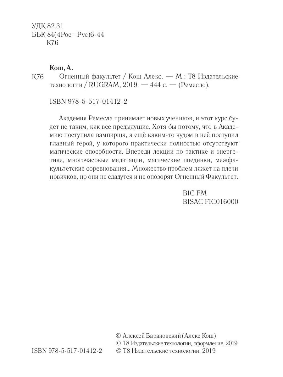 Академия Ремесла принимает новых учеников, и этот курс будет не таким, как все предыдущие. Хотя бы потому, что в Академию поступила вампирша, а ещё каким-то чудом в неё поступил главный герой, у которого практически полностью отсутствуют магические способности. Впереди лекции по тактике и энергетике, многочасовые медитации, магические поединки, межфакультетские соревнования... Множество проблем ляжет на плечи новичков, но они не сдадутся и не опозорят Огненный Факультет.| Издательство | Т8 RUGRAM |