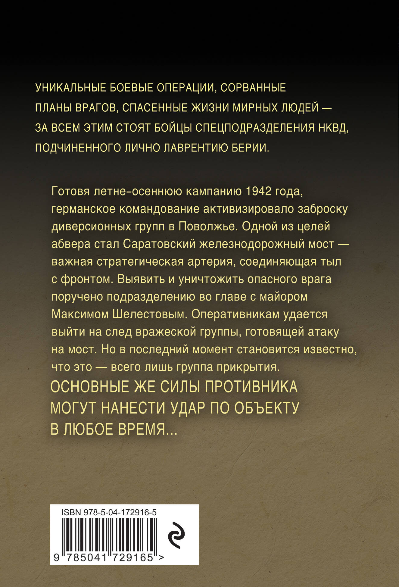 Роман о военном времени, о сложных судьбах и опасной работе неизвестных героев, вошедших в ударный состав «спецназа Берии». Общий тираж книг А. Тамоникова - более 10 миллионов экземпляров. Готовя летне-осеннюю кампанию 1942 года, германское командование активизировало заброску диверсионных групп в Поволжье. Одной из целей абвера стал Саратовский железнодорожный мост - важная стратегическая артерия, соединяющая тыл с фронтом. Выявить и уничтожить опасного врага поручено подразделению во главе с майором Максимом Шелестовым. Оперативникам удается выйти на след вражеской группы, готовящей атаку на мост. Но в последний момент становится известно, что это - всего лишь группа прикрытия. Основные же силы противника могут нанести удар по объекту в любое время…