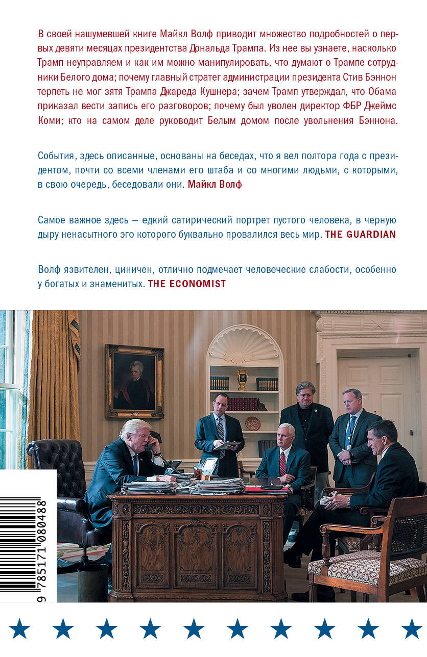 Один год с Дональдом Трампом Эта книга буквально взорвала книжный рынок Америки, заняв первое место на Амазоне, став бестселлером номер один по версии New York Times и разойдясь тиражом более 2 миллионов экземпляров. За ней выстраивались многокилометровые ночные очереди. Ее обсуждали и ею восторгались. Эта книга о самом странном, самом необычном, самом экстравагантном и самом непонятном из всех президентов США - Дональде Джоне Трампе. Его приход к власти был настоящим шоком. Журналы и телекомпании во время предвыборной гонки накопали столько компромата, что хватило бы для того, чтобы потопить сразу несколько политических карьер. Он никогда не занимал никаких государственных постов. Но, несмотря на все это, он выиграл. Правление Трампа получилось еще более парадоксальным. Практически все его окружение считает 45-го президента дилетантом, находящимся не на своем месте, при этом он продолжает руководить страной, а его поручения, порой абсурдные и взбалмошные, исполняются. Происходящее в этой книге порой так невероятно, так фантастично, что невольно задаешься вопросом, а не придумал ли это все сам автор. Но у Волфа есть десятки часов аудиозаписей разговоров, на основе которых написана книга. И с этим уже не поспоришь. В книге приоткрыта завеса тайны над многими процессами, происходящими в Белом доме, начиная со странных, нелогичных и непоследовательных переговоров с Кремлем и заканчивая войной, объявленной Трампом журналистам.| Издательство | ИЗДАТЕЛЬСТВО "АСТ" |