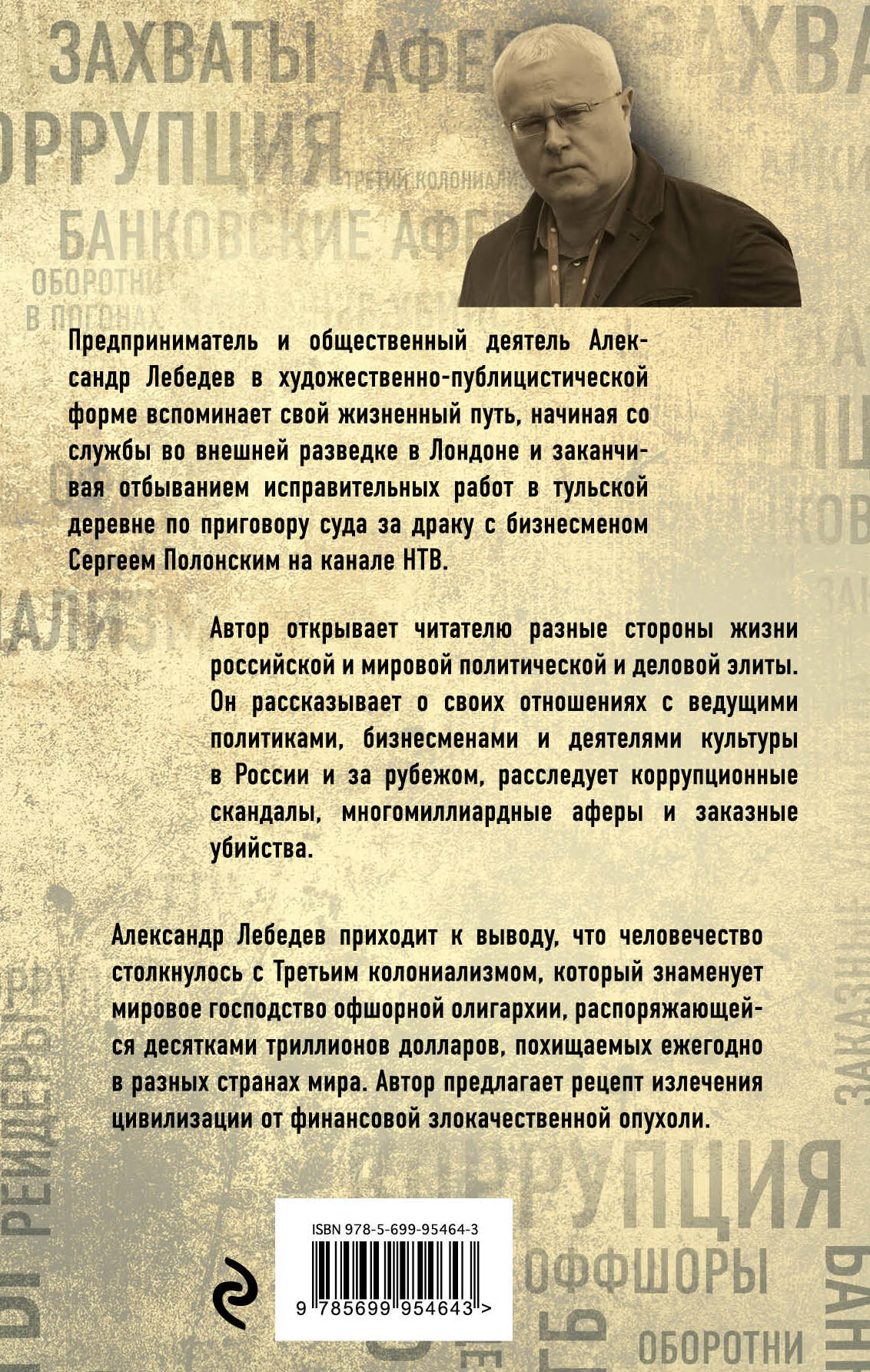 Предприниматель и общественный деятель Александр Лебедев в художественно-публицистической форме вспоминает свой жизненный путь, начиная от службы во внешней разведке в Лондоне и заканчивая отбыванием исправительных работ в тульской деревне по приговору суда за драку с бизнесменом Сергеем Полонским на канале НТВ. Автор открывает читателю разные стороны жизни российской и мировой политической и деловой элиты. Он рассказывает о своих отношениях с ведущими политиками, бизнесменами и деятелями культуры в России и за рубежом, расследует коррупционные скандалы, многомиллиардные аферы и заказные убийства. Александр Лебедев приходит к выводу, что человечество столкнулось с Третьим колониализмом, который знаменует мировое господство офшорной олигархии, распоряжающейся десятками триллионов долларов, похищаемых ежегодно в разных странах мира. Автор предлагает рецепт излечения цивилизации от финансовой злокачественной опухоли.| Издательство | ООО "Издательство "Эксмо" |