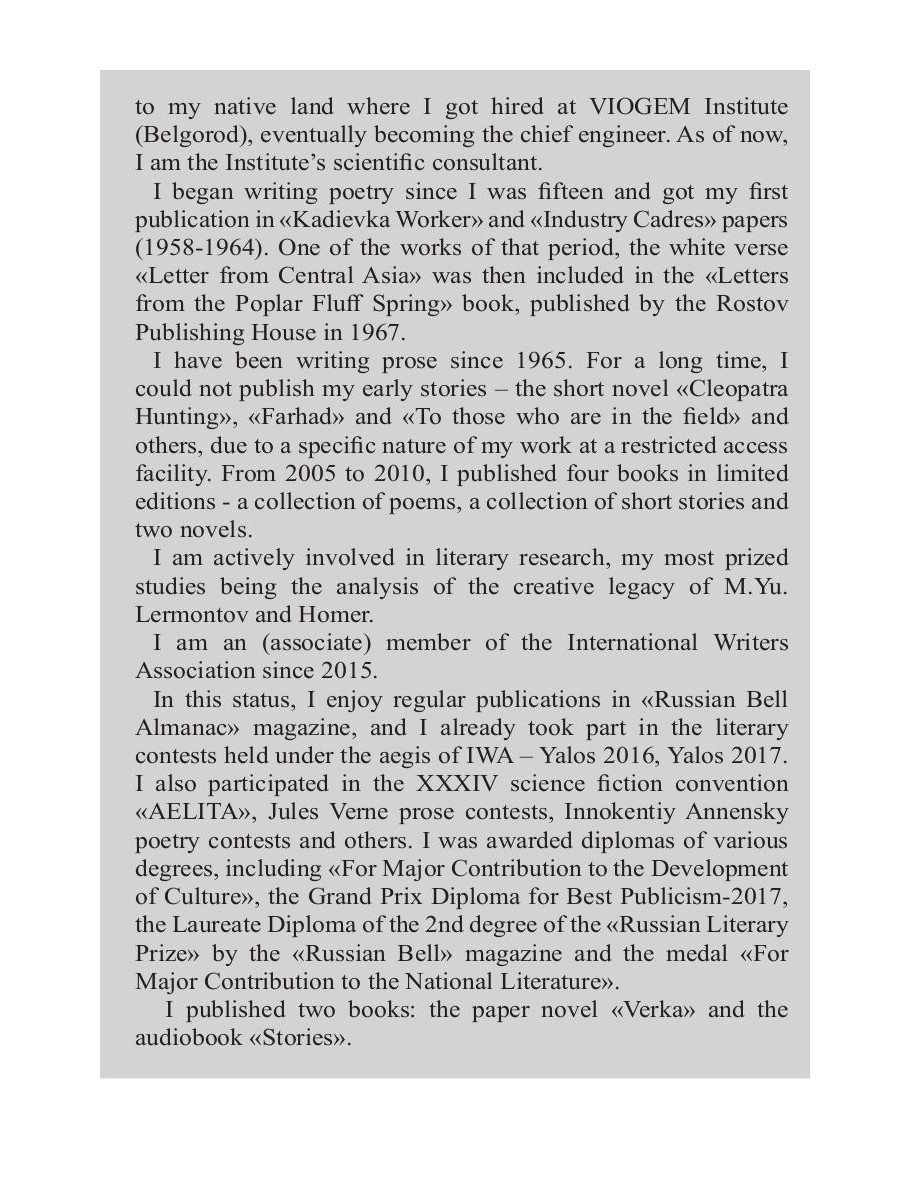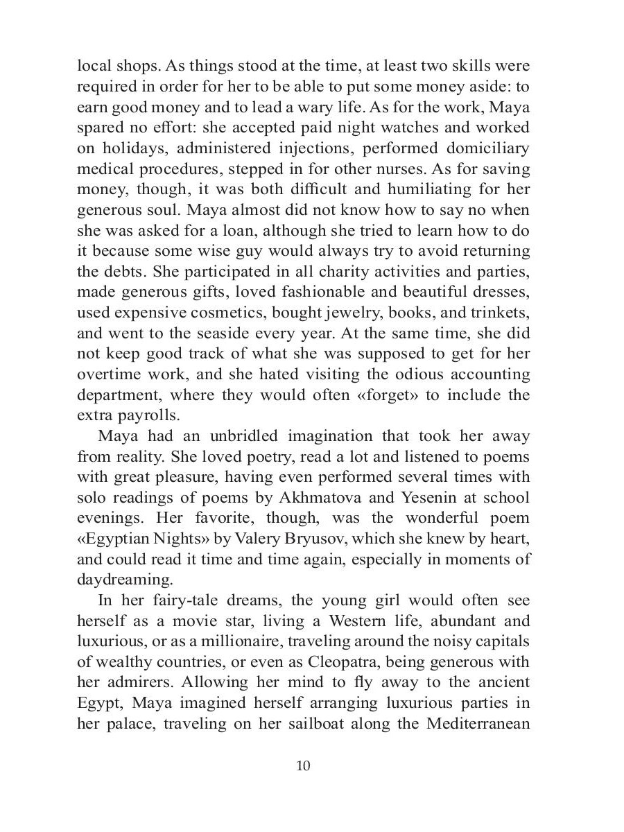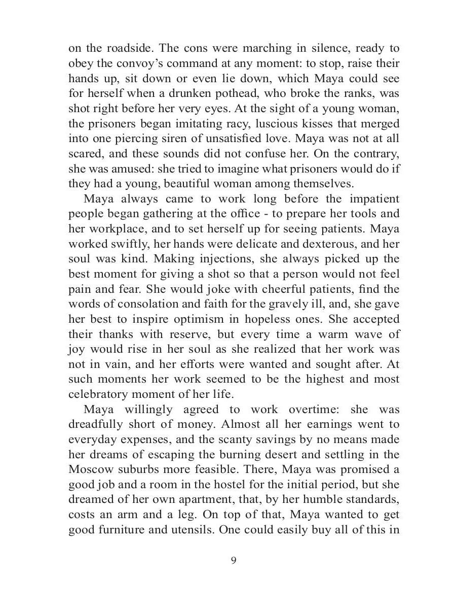 «Я - испорченная цивилизацией девушка, и здесь, в пустыне, мне скучно. Как послушный медицинский работник, усердно исполняю свой долг, потому что дала клятву Гиппократа и подписку секретному ведомству, которое обеспечило меня льготами на учебу в престижном учебном заведении». Постепенно девушка втягивается в дурные компании, потому что любит развлечения, дорогие вещи и украшения. И скатывается в пучину, что заканчивается для нее трагически. Она навсегда остается в розовых песках безбрежной пустыни.| Издательство | Т8 RUGRAM |