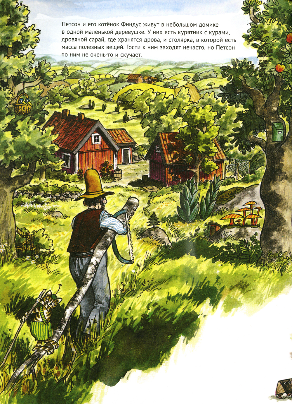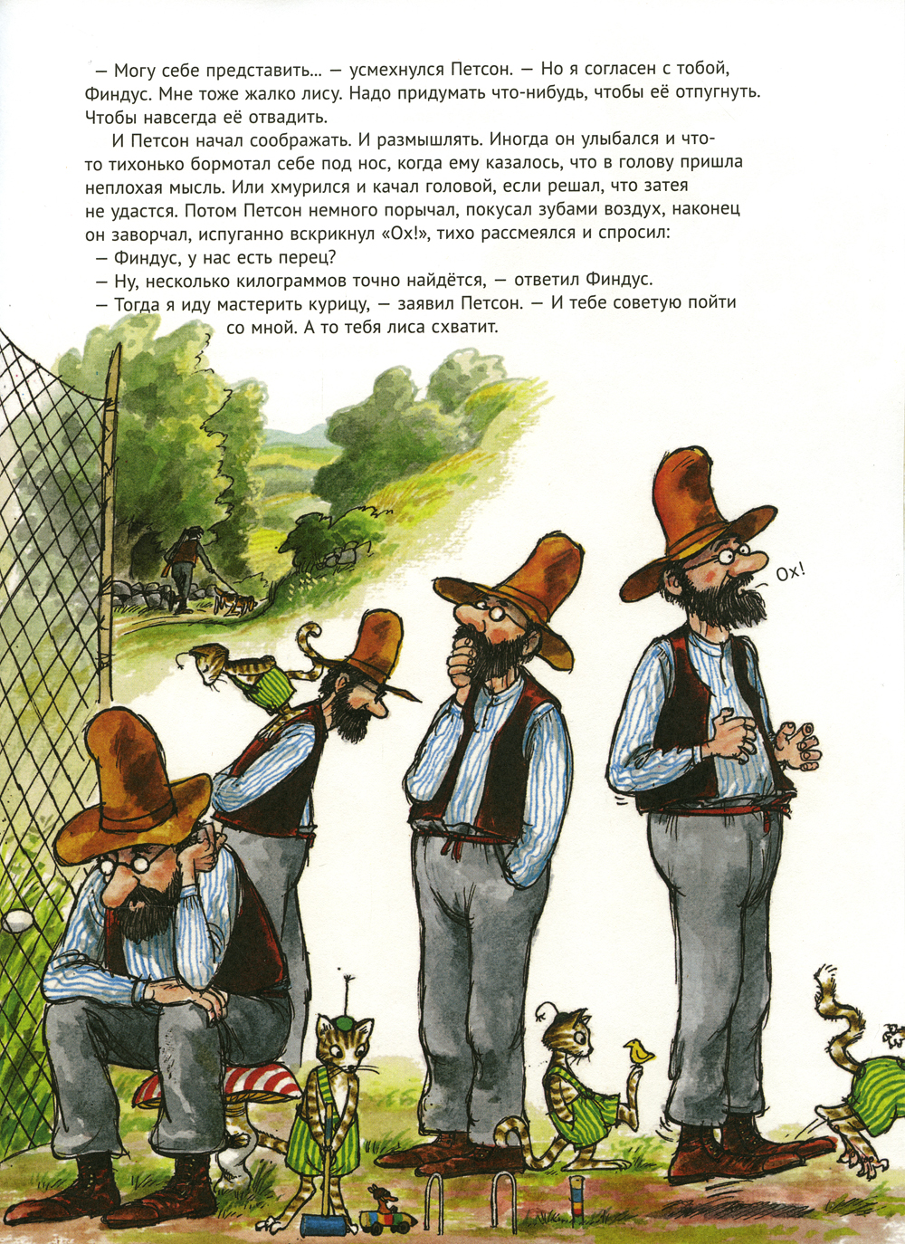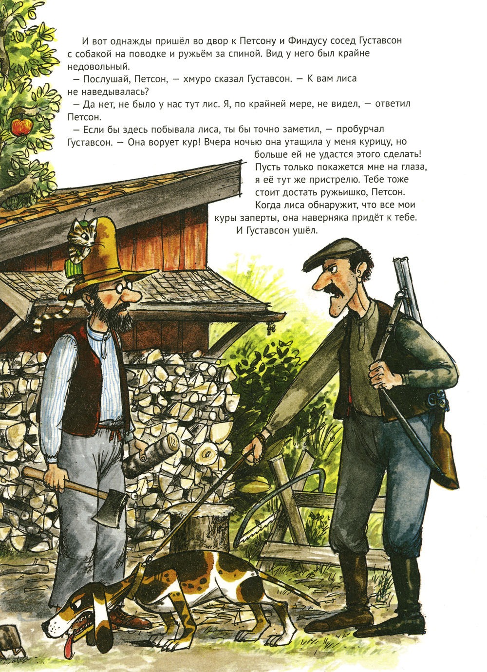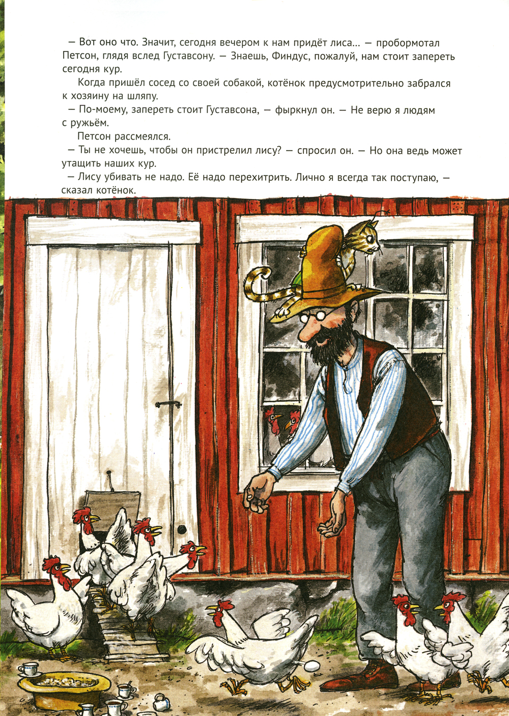 Петсон, его друг котенок Финдус и их куры мирно живут в маленькой шведской деревушке. Но однажды в деревне появилась лиса. И стала таскать кур. Сосед Густавсон решил пристрелить лису. О том, как Петсон и Финдус спасали кур от лисы, а лису от соседа, рассказывается в этой презабавной книжке.
