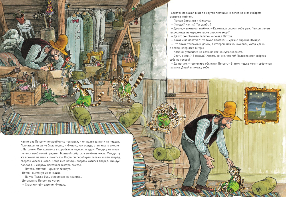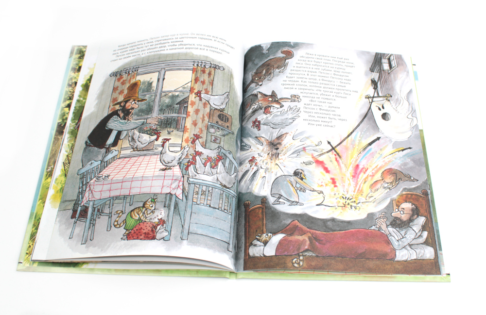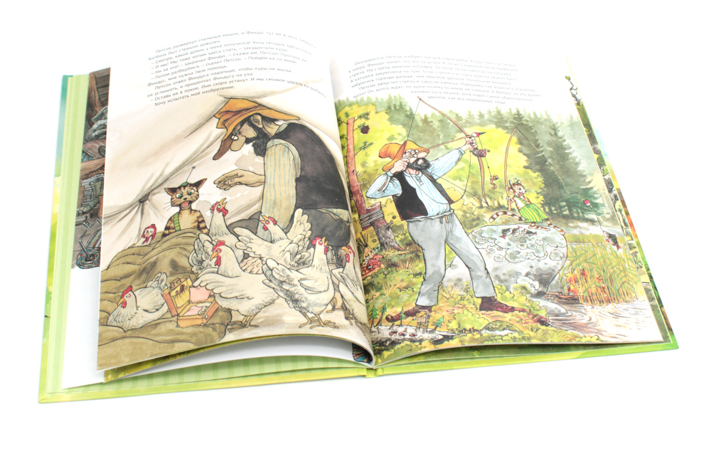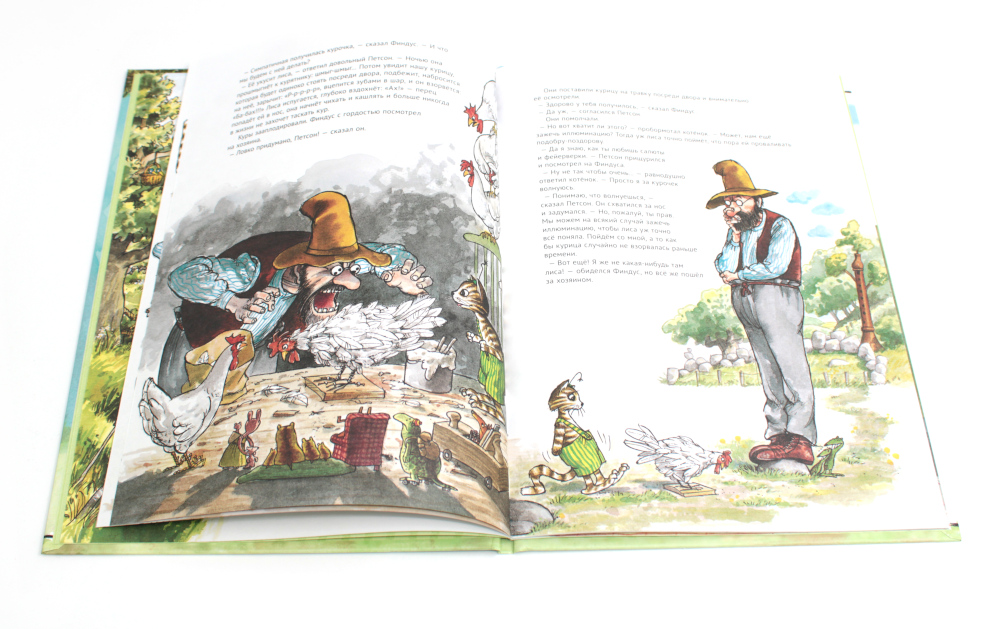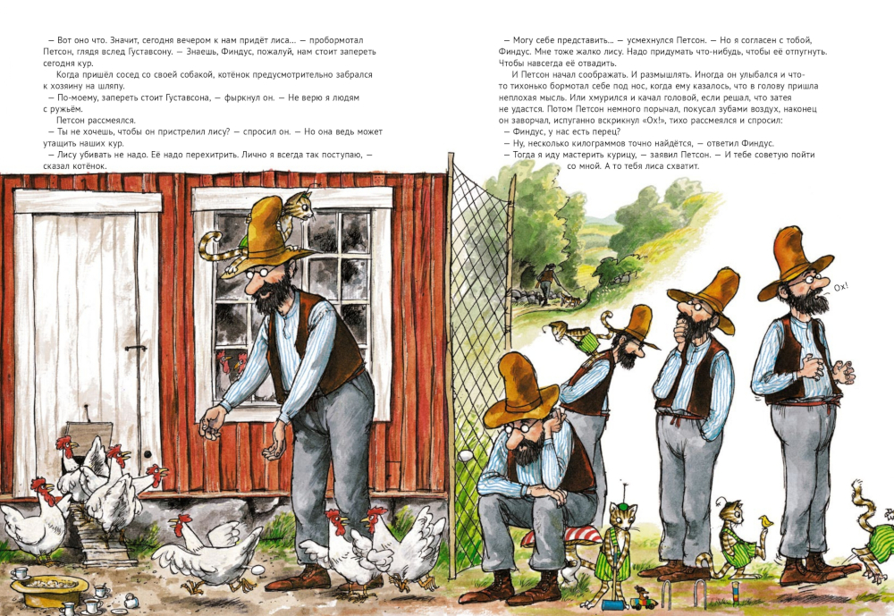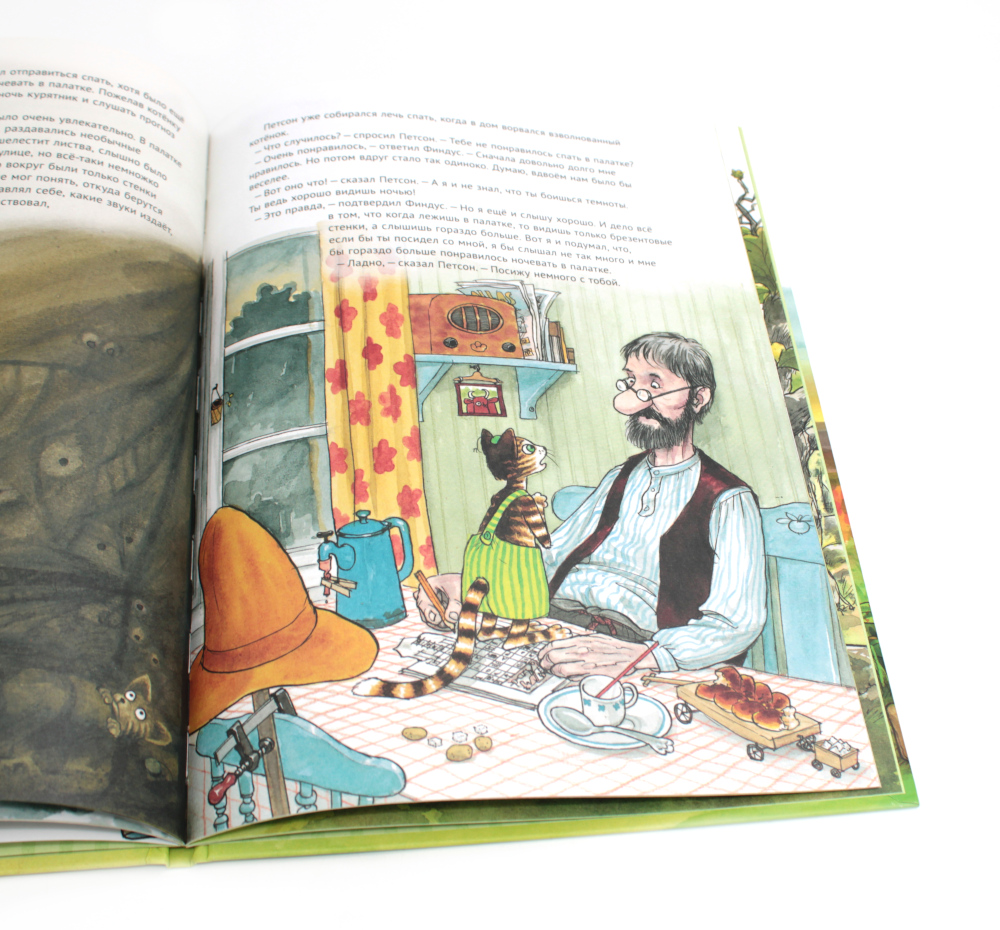 Комплект из 2 книг: «Охота на лис», «Петсон идет в поход» «Охота на лис» Однажды к Петсону и Финдусу зашел их сосед Густавсон, который сказал, что в округе появилась лиса, ворующая кур. Но Финдус против охоты на лис, лису надо перехитрить, считает он. Поэтому вместе с Петсоном они придумывают хитроумный способ напугать лису, чтобы ей больше было неповадно наведываться в курятники. Друзья приготовили для лисы настоящее светопредставление: взрывы петард и фейерверков, чучело курицы, наполенной перцем и даже настоящее привидение! И не только отвадили лису от своего курятника, но и навсегда отучили Густавсона от охоты на лис. «Петсон идет в поход» Однажды котенок Финдус нашел на чердаке у Петсона старую палатку и ему безудержно захотелось пойти в поход, а Петсону как раз надо испытать его новое изобретение - лук для ловли рыбы. Так что друзья собирают рюкзак и отправляются на озеро. Но по пути к ним привязываются куры, которые никак не хотят отпускать их. Тогда Петсон и Финдус ставят палатку в саду и ночуют под яблоней. И получается почти как настоящий поход.| Издательство | Белая ворона/ALBUS CORVUS |