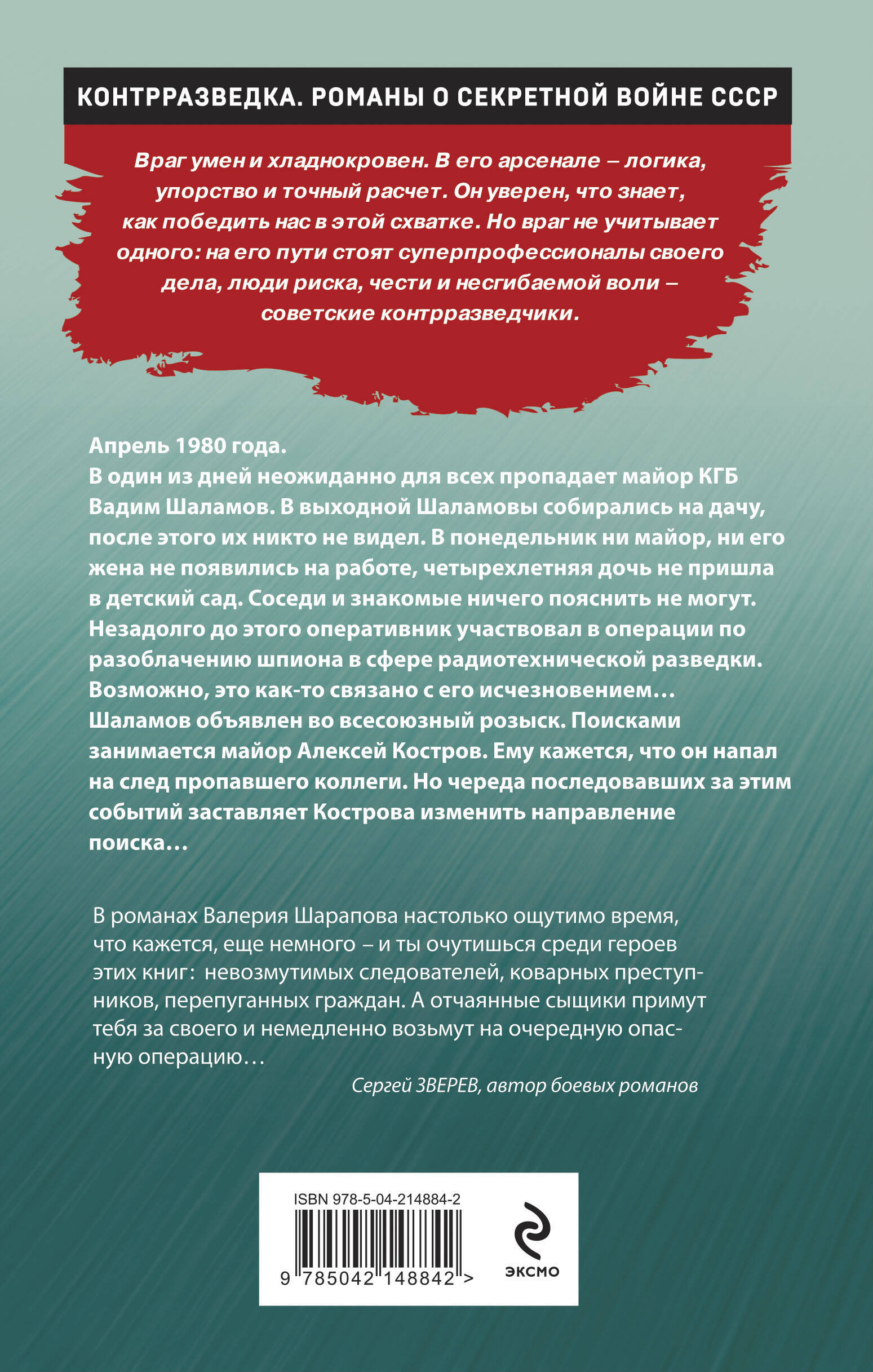 Апрель 1980 года. В один из дней неожиданно для всех пропадает майор КГБ Вадим Шаламов. В выходной Шаламовы собирались на дачу, после этого их никто не видел. В понедельник ни майор, ни его жена не появились на работе, четырехлетняя дочь не пришла в детский сад. Соседи и знакомые ничего пояснить не могут. Незадолго до этого оперативник участвовал в операции по разоблачению шпиона в сфере радиотехнической разведки. Возможно, это как-то связано с его исчезновением… Шаламов объявлен во всесоюзный розыск. Поисками занимается майор Алексей Костров. Ему кажется, что он напал на след пропавшего коллеги. Но череда последовавших за этим событий заставляет Кострова изменить направление поиска… Враг умен и хладнокровен. В его арсенале - логика, упорство и точный расчет. Он уверен, что знает, как победить нас в этой схватке. Но враг не учитывает одного: на его пути стоят суперпрофессионалы своего дела, люди риска, чести и несгибаемой воли - советские контрразведчики. ------------------------------ «В романах Валерия Шарапова настолько ощутимо время, что кажется, еще немного, и ты очутишься среди героев этих книг - невозмутимых следователей, коварных преступников, перепуганных граждан. А отчаянные сыщики примут тебя за своего и немедленно возьмут на очередную опасную операцию…» - Сергей ЗВЕРЕВ, автор боевых романов| Издательство | ООО "Издательство "Эксмо" |