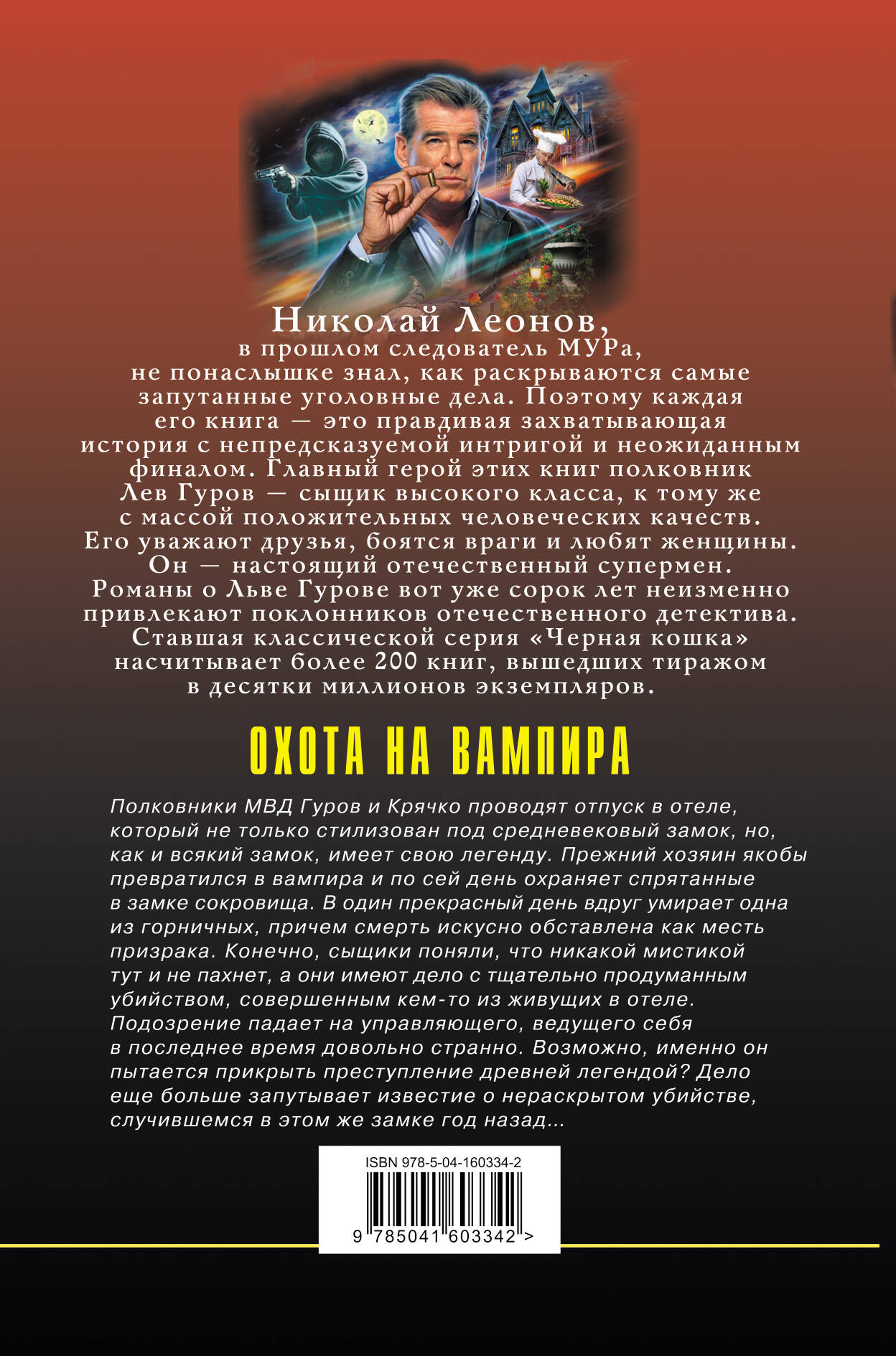Еще одна книга легендарного тандема Леонов-Макеев. Полковники МВД Гуров и Крячко проводят отпуск в отеле, который не только стилизован под средневековый замок, но, как и всякий замок, имеет свою легенду. Прежний хозяин якобы превратился в вампира и по сей день охраняет спрятанные в замке сокровища. В один прекрасный день вдруг умирает одна из горничных, причем смерть искусно обставлена как месть призрака. Конечно, сыщики поняли, что никакой мистикой тут и не пахнет, а они имеют дело с тщательно продуманным убийством, совершенным кем-то из живущих в отеле. Подозрение падает на управляющего, ведущего себя в последнее время довольно странно. Возможно, именно он пытается прикрыть преступление древней легендой? Дело еще больше запутывает известие о нераскрытом убийстве, случившемся в этом же замке год назад… Николай Леонов, в прошлом следователь МУРа, не понаслышке знал, как раскрываются самые запутанные уголовные дела. Поэтому каждая его книга - это правдивая захватывающая история с непредсказуемой интригой и неожиданным финалом. Главный герой этих книг, полковник Лев Гуров - сыщик высокого класса, к тому же с массой положительных человеческих качеств. Его уважают друзья, боятся враги и любят женщины. Он - настоящий отечественный супермен. Романы о Льве Гурове вот уже сорок лет неизменно привлекают поклонников отечественного детектива. Ставшая классической серия «Черная кошка» насчитывает более 200 книг, вышедших тиражом в десятки миллионов экземпляров.| Издательство | ООО "Издательство "Эксмо" |