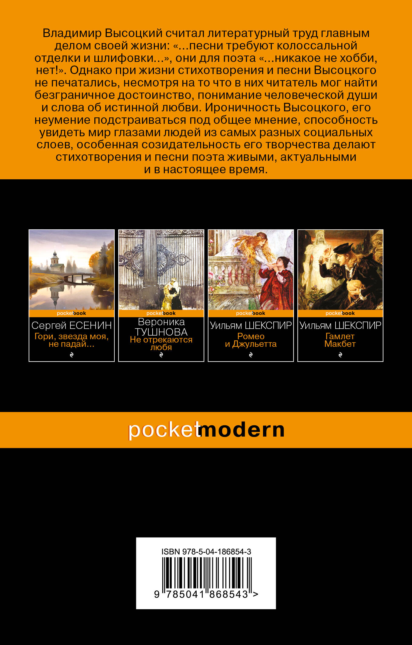 Владимир Высоцкий считал литературный труд главным делом своей жизни: «... песни требуют колоссальной отделки и шлифовки...», они для поэта - «... никакое не хобби, нет!». Однако при жизни стихотворения и песни Высоцкого не печатались, несмотря на то, что в них читатель мог найти безграничное достоинство, понимание человеческой души и слова об истинной любви. Ироничность Высоцкого, его неумение подстраиваться под общее мнение, способность увидеть мир глазами людей из самых разных социальных слоев, особенная созидательность его творчества делают стихотворения и песни поэта живыми, актуальными и в настоящее время.| Издательство | ООО "Издательство "Эксмо" |