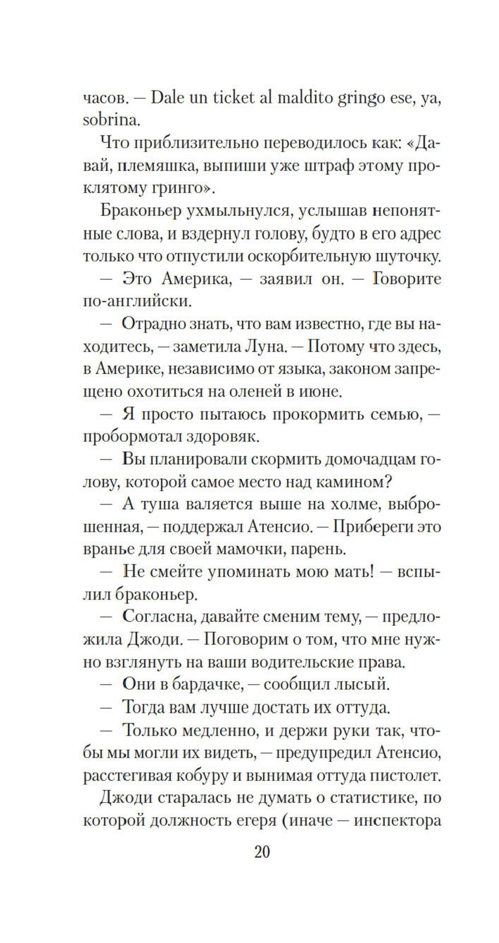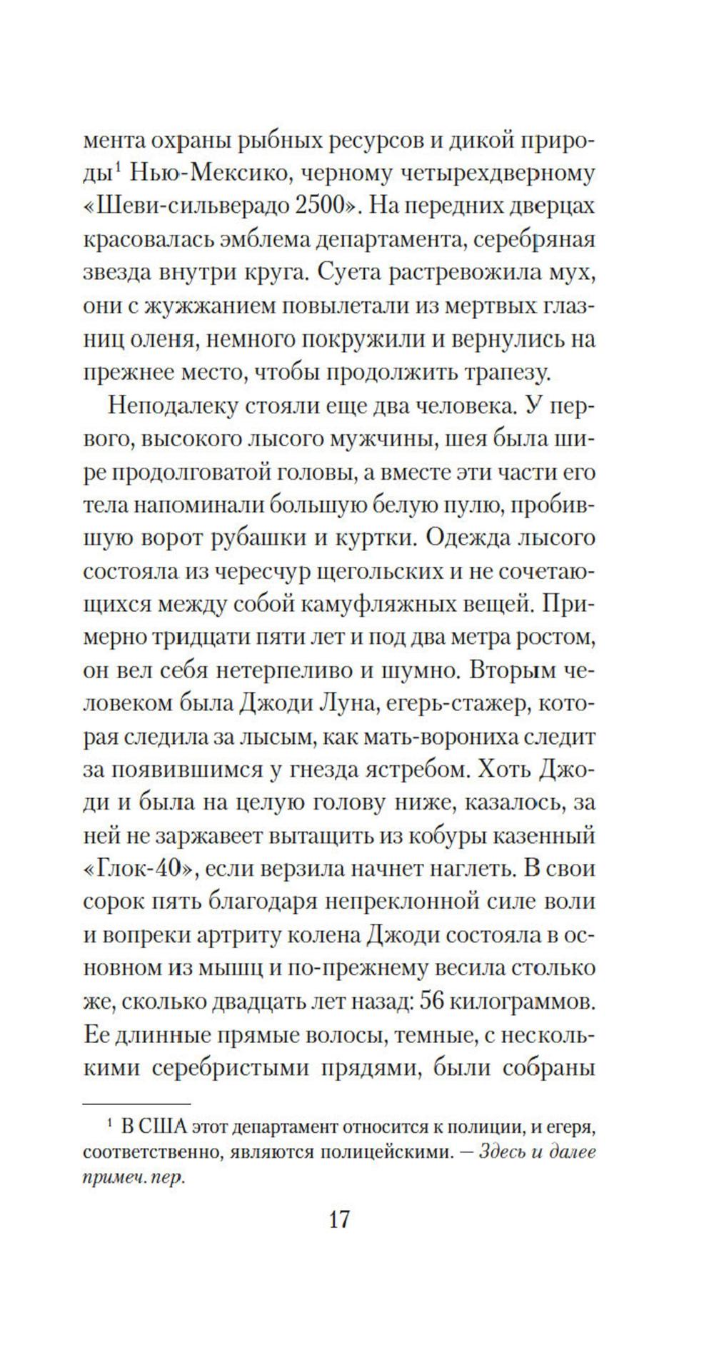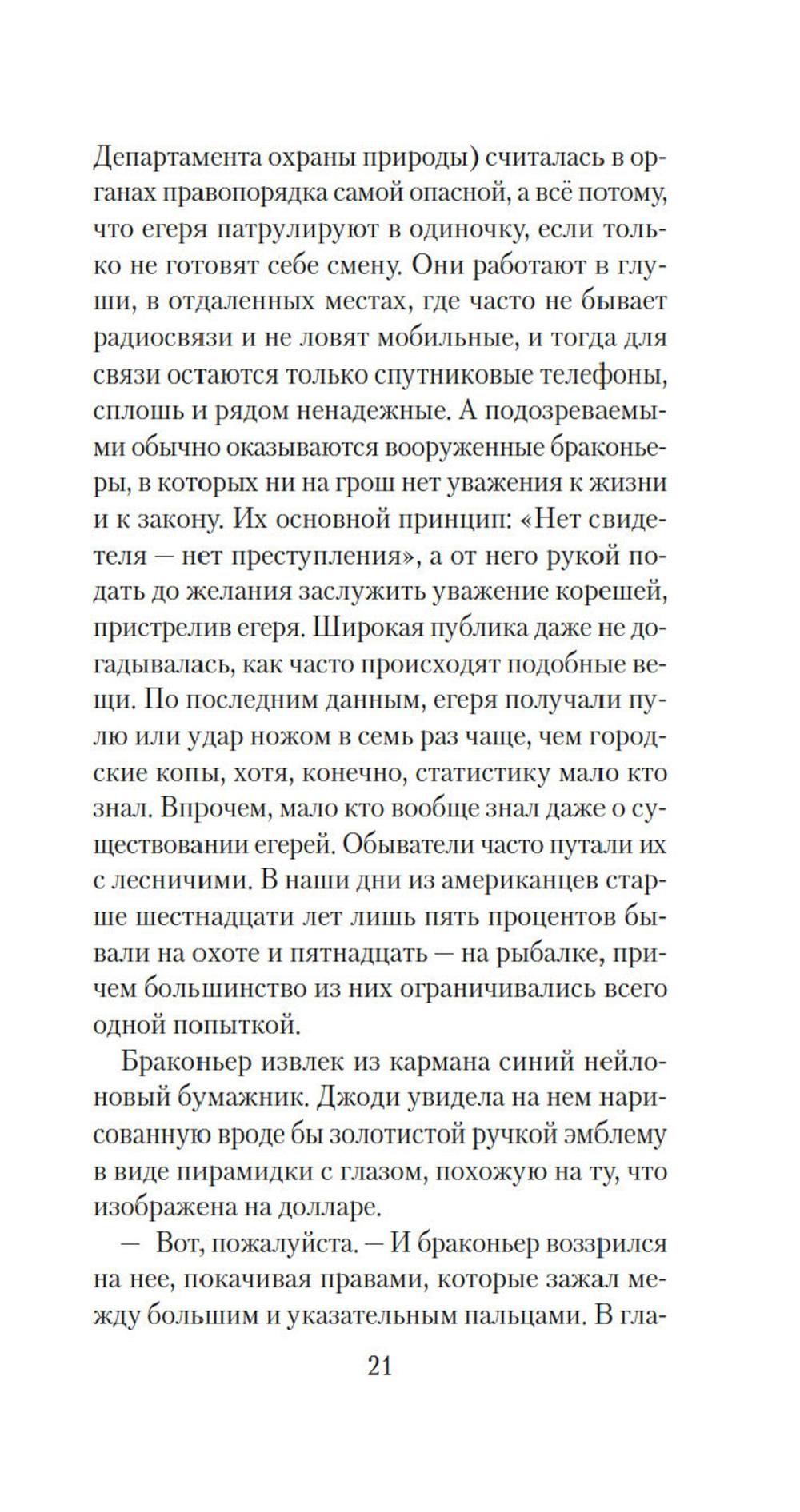 Охота на человека - возможно ли даже предположить такое в наши дни? Джоди Луна, оставившая Бостонский университет ради работы егерем в родном штате Нью-Мексико, в первую же неделю вынуждена задаться этим вопросом: туристы находят среди живописного поля отрезанную женскую руку... Джоди - не новичок в этих диких краях: ее семья жила здесь на протяжении нескольких поколений. Принципиальная и решительная, инспектор Луна пытается навести на своем участке порядок - но как это сделать, если пойманный ею на месте преступления браконьер Трэвис вместо раскаяния грозит принять ответные меры, а продажная полиция бездействует? Игра в кошки-мышки приводит Луну к шайке сторонников превосходства белой расы, которые похищают цветных женщин, чтобы угодить своему жестокому лидеру по кличке Генерал Зеб. И Джоди вступает в смертельное противостояние с бандитами, которое грозит опасностью не только ей самой, но и ее близким.| Издательство | Иностранка |