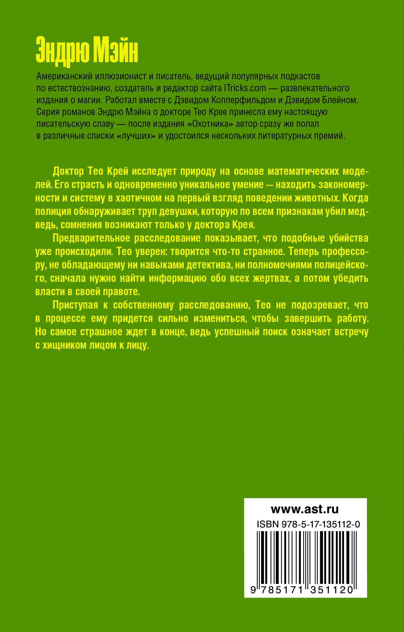 Доктор Тео Крей исследует природу на основе математических моделей. Его страсть и одновременно уникальное умение - находить закономерности и систему в хаотичном на первый взгляд поведении животных. Когда полиция обнаруживает труп девушки, которую по всем признакам убил медведь, сомнения возникают только у доктора Крея. Предварительное расследование показывает, что подобные убийства уже происходили. Тео уверен: творится что-то странное. Теперь профессору, не обладающему ни навыками детектива, ни полномочиями полицейского, сначала нужно найти информацию обо всех жертвах, а потом убедить власти в своей правоте. Приступая к собственному расследованию, Тео не подозревает, что в процессе ему придется сильно измениться, чтобы завершить работу. Но самое страшное ждет в конце, ведь успешный поиск означает встречу с хищником лицом к лицу.