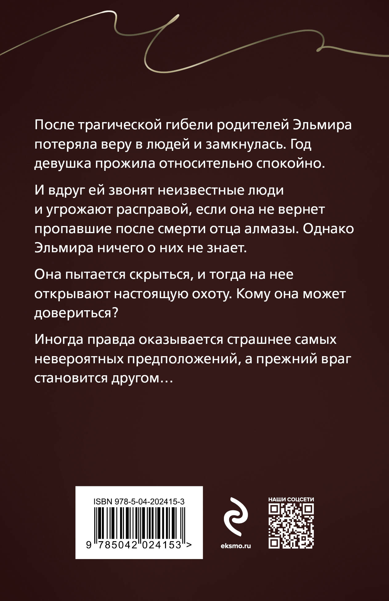 После трагической гибели родителей Эльмира потеряла веру в людей и замкнулась. Год девушка прожила относительно спокойно. И вдруг ей звонят неизвестные люди и угрожают расправой, если она не вернет пропавшие после смерти отца алмазы. Однако Эльмира ничего о них не знает. Она пытается скрыться, и тогда на нее открывают настоящую охоту. Кому она может довериться? Иногда правда оказывается страшнее самых невероятных предположений, а прежний враг становится другом… В детективных мелодрамах Галины Романовой переплелись и кровь, и слезы, и любовь. Все, как в жизни! Нежные чувства проверяются настоящими испытаниями, где награда - сама жизнь. Каждая история по-своему уникальна и не кажется вымыслом! И все они объединены общей темой: настоящая любовь всегда побеждает, а за преступлением непременно следует наказание.