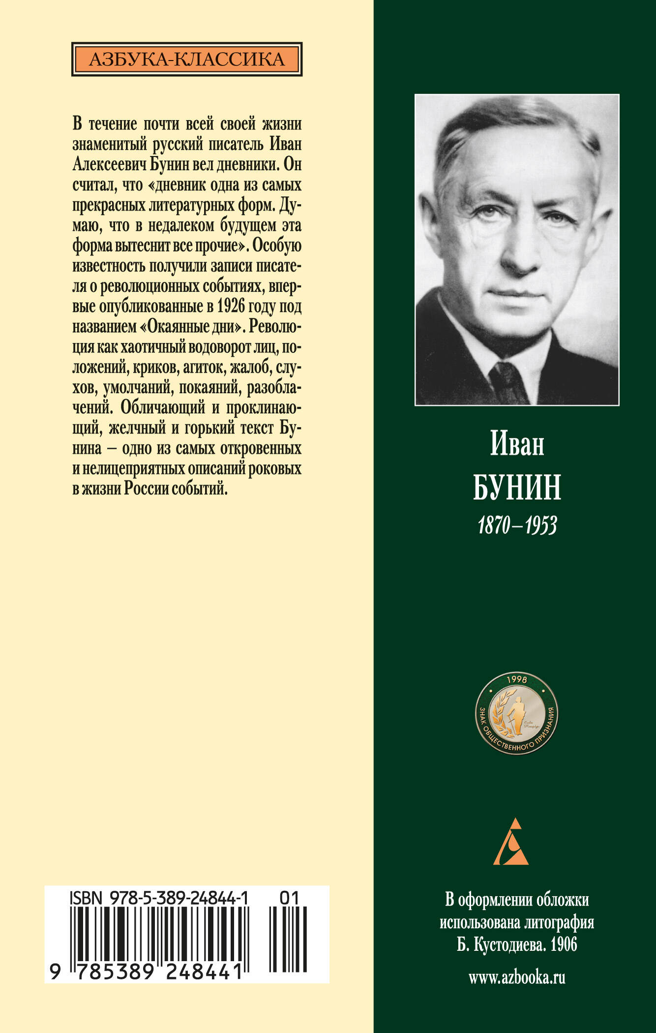 В течение почти всей своей жизни знаменитый русский писатель Иван Алексеевич Бунин вел дневники. Он считал, что "дневник одна из самых прекрасных литературных форм. Думаю, что в недалеком будущем эта форма вытеснит все прочие". Особую известность получили записи писателя о революционных событиях, впервые опубликованные в 1926 году под названием "Окаянные дни". Революция как хаотичный водоворот лиц, положений, криков, агиток, жалоб, слухов, умолчаний, покаяний, разоблачений. Обличающий и проклинающий, желчный и горький текст Бунина - одно из самых откровенных и нелицеприятных описаний роковых в жизни России событий.| Издательство | Азбука-Аттикус Издат.группа ООО |