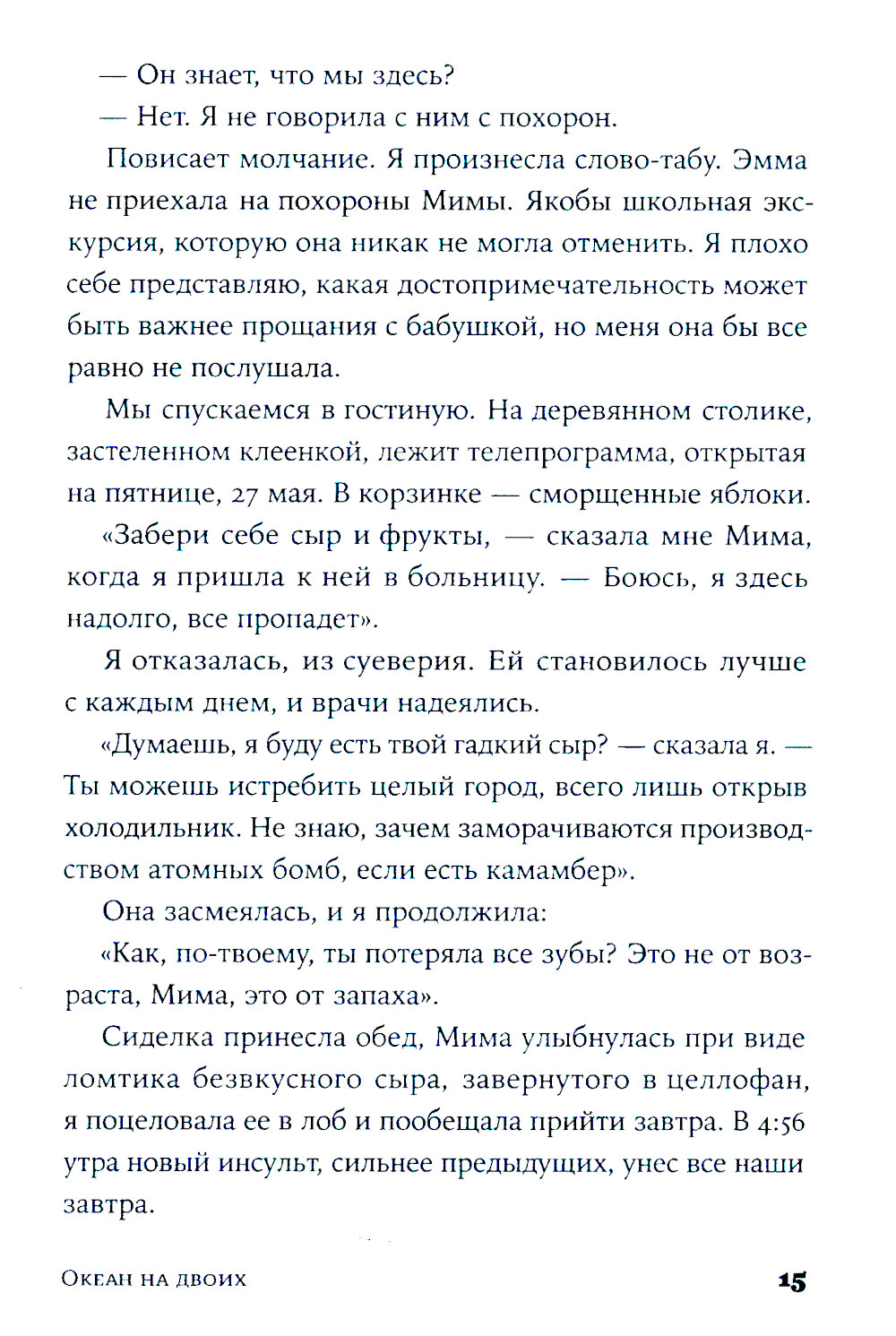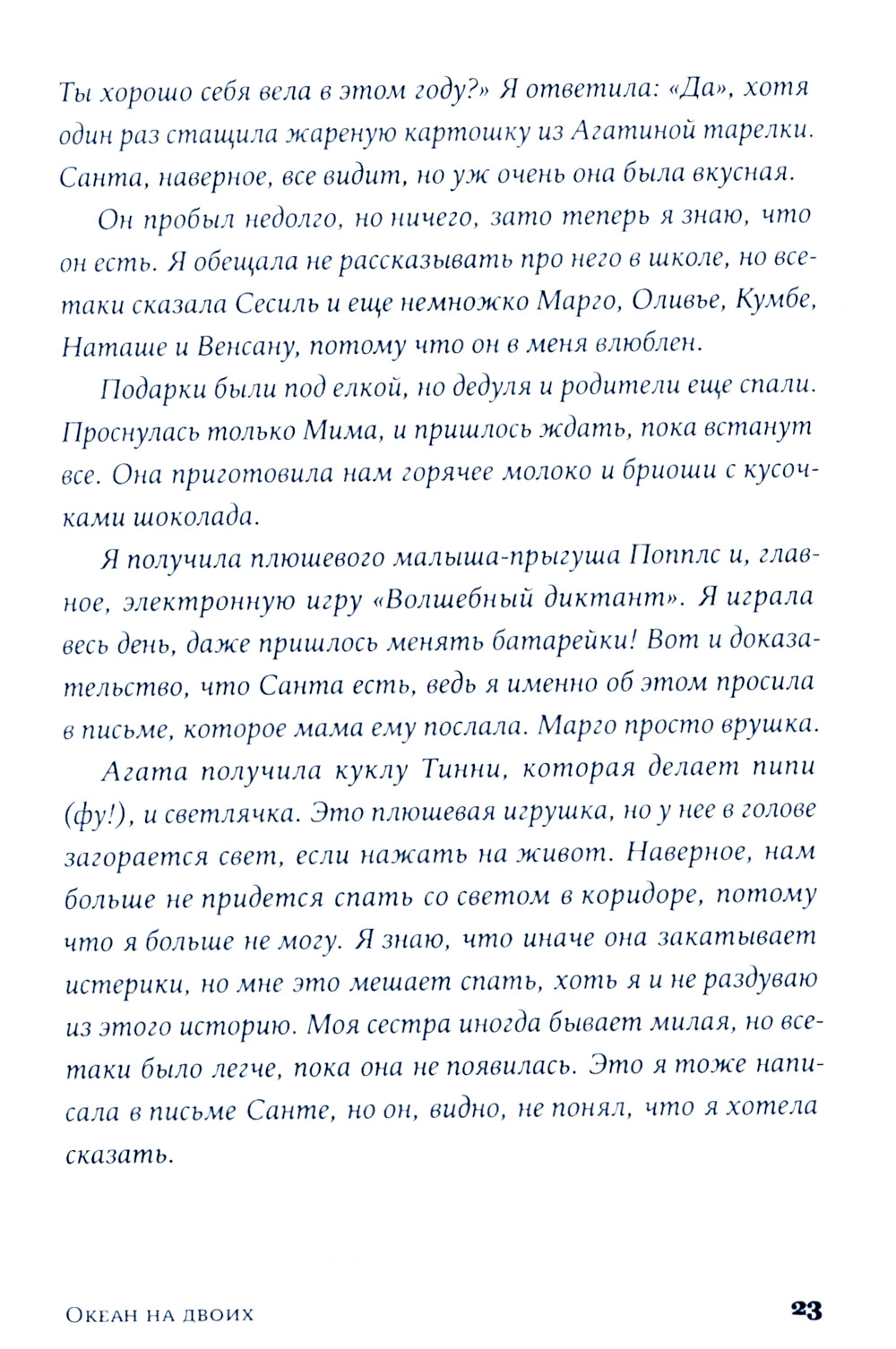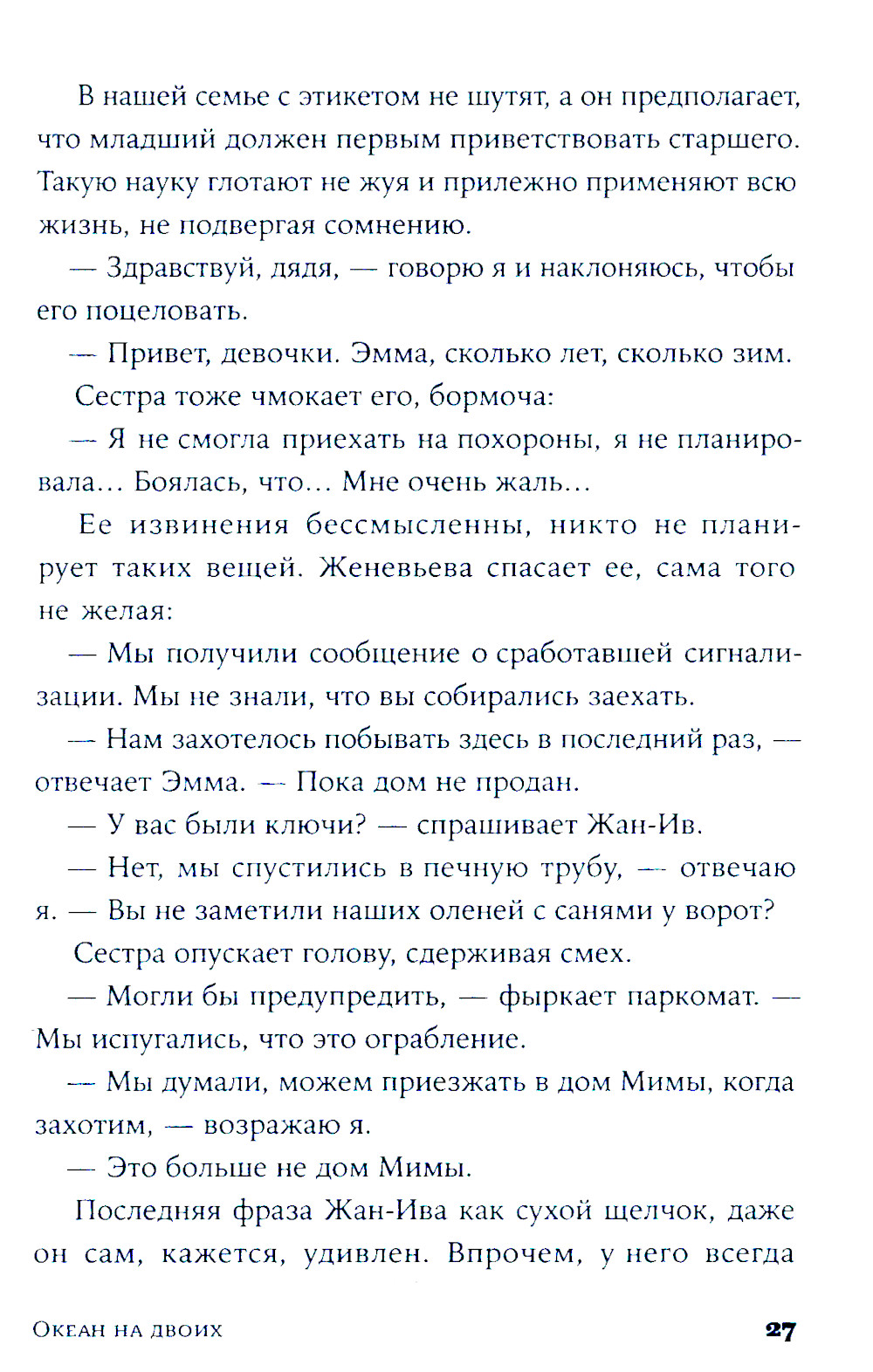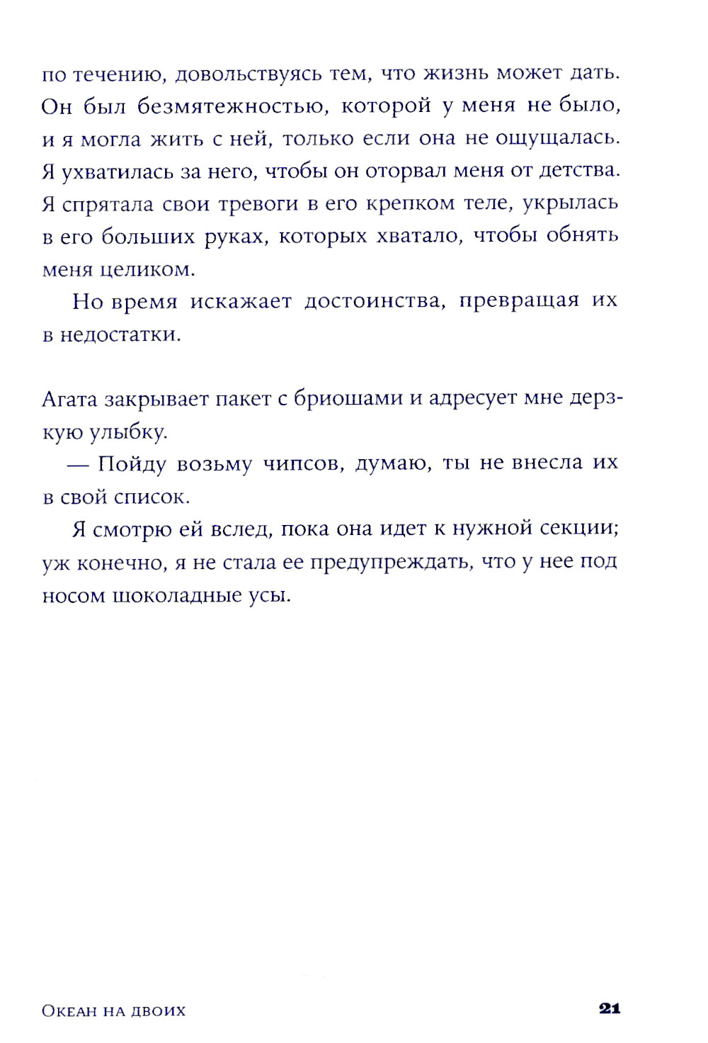 Две сестры. Два непохожих характера. Одно прошлое, полное боли и радости. Спустя пять лет молчания Эмма и Агата встречаются в доме любимой бабушки Мимы, который вскоре перейдет к новым владельцам. Здесь, в сердце Страны Басков, где они в детстве проводили беззаботные летние каникулы, сестрам предстоит разобраться в воспоминаниях и залечить душевные раны. «Океан на двоих» - проникновенный роман о силе сестринской любви, которая может выдержать даже самые тяжелые испытания. Одна из лучших современных писательниц Франции Виржини Гримальди с присущим ей мастерством и юмором раскрывает сложные темы взаимоотношений в семье и потери близких. Эта красивая история, которая с легкостью и точностью справляется с трудными вопросами, заставит смеяться и плакать, сопереживать героиням и размышлять о том, что делает жизнь по-настоящему прекрасной.| Издательство | Альпина Паблишер |