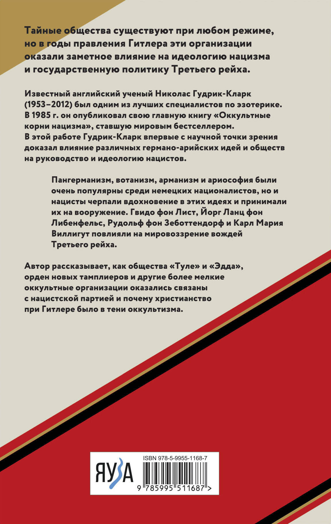 Был ли оккультизм широко распространен в Третьем рейхе? Почему лидеры тайных обществ стали наставниками лидеров нацистской Германии? Известный английский ученый Николас Гудрик-Кларк (1953-2012) был одним из лучших специалистов по эзотерике. В 1985 г. он опубликовал свою главную книгу «Оккультные корни нацизма», ставшую мировым бестселлером. В этой работе Гудрик-Кларк впервые с научной точки зрения доказал влияние различных германо-арийских идей и обществ на руководство и идеологию нацистов. Пангерманизм, вотанизм, арманизм и ариософия были очень популярны среди немецких националистов, но и нацисты черпали вдохновение в этих идеях и принимали их на вооружение. Гвидо фон Лист, Йорг Ланц фон Либенфельс, Рудольф фон Зеботтендорф и Карл Мария Виллигут повлияли на мировоззрение вождей Третьего рейха. Автор рассказывает, как общества «Туле» и «Эдда», орден новых тамплиеров и другие более мелкие оккультные организации оказались связаны с нацистской партией и почему христианство при Гитлере оказалось в тени оккультизма.| Издательство | Яуза-пресс ООО |