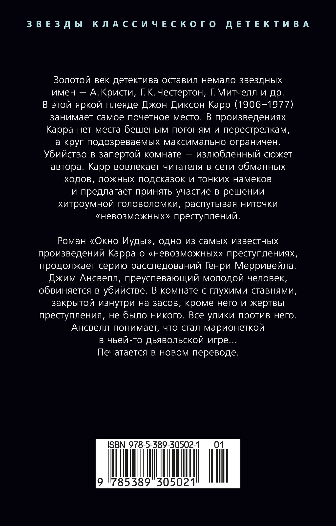 Золотой век детектива оставил немало звездных имен - А. Кристи, Г. К. Честертон, Г. Митчелл и др. В этой яркой плеяде Джон Диксон Карр (1906-1977) занимает самое почетное место. В произведениях Карра нет места бешеным погоням и перестрелкам, а круг подозреваемых максимально ограничен. Убийство в запертой комнате - излюбленный сюжет автора. Карр вовлекает читателя в сети обманных ходов, ложных подсказок и тонких намеков и предлагает принять участие в решении хитроумной головоломки, распутывая ниточки «невозможных» преступлений. Роман «Окно Иуды», одно из самых известных произведений Карра о «невозможных» преступлениях, продолжает серию расследований Генри Мерривейла. Джим Ансвелл, преуспевающий молодой человек, обвиняется в убийстве. В комнате с глухими ставнями, закрытой изнутри на засов, кроме него и жертвы преступления, не было никого. Все улики против него. Ансвелл понимает, что стал марионеткой в чьей-то дьявольской игре. Роман был опубликован впервые в 1938 году под псевдонимом Картера Диксона. Печатается в новом переводе. Книга станет отличным подарком для ценителей творчества Карра, а также всех поклонников классического детектива.
