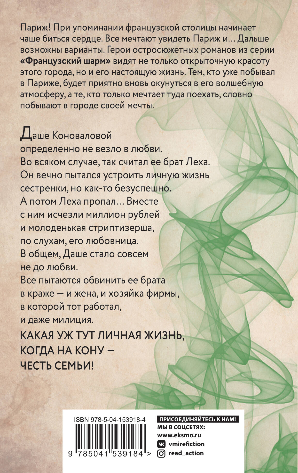 Даше Коноваловой определенно не везло в любви. Во всяком случае, так считал ее брат Леха. Он вечно пытался устроить личную жизнь сестренки, но как-то безуспешно. А потом Леха пропал… Вместе с ним исчезли миллион рублей и молоденькая стриптизерша, по слухам, его любовница. В общем, Даше стало совсем не до любви. Все пытаются обвинить ее брата в краже - и жена, и хозяйка фирмы, в которой тот работал, и даже милиция. Какая уж тут личная жизнь, когда на кону - честь семьи! Париж! При упоминании французской столицы начинает чаще биться сердце. Все мечтают увидеть Париж и… Дальше возможны варианты. Герои остросюжетных романов из серии «Детектив в Париже» видят не только открыточную красоту этого города, но и его настоящую жизнь. Тем, кто уже побывал в Париже, будет приятно вновь окунуться в его волшебную атмосферу, а те, кто только мечтает туда поехать, словно побывают в городе своей мечты.| Издательство | ООО "Издательство "Эксмо" |