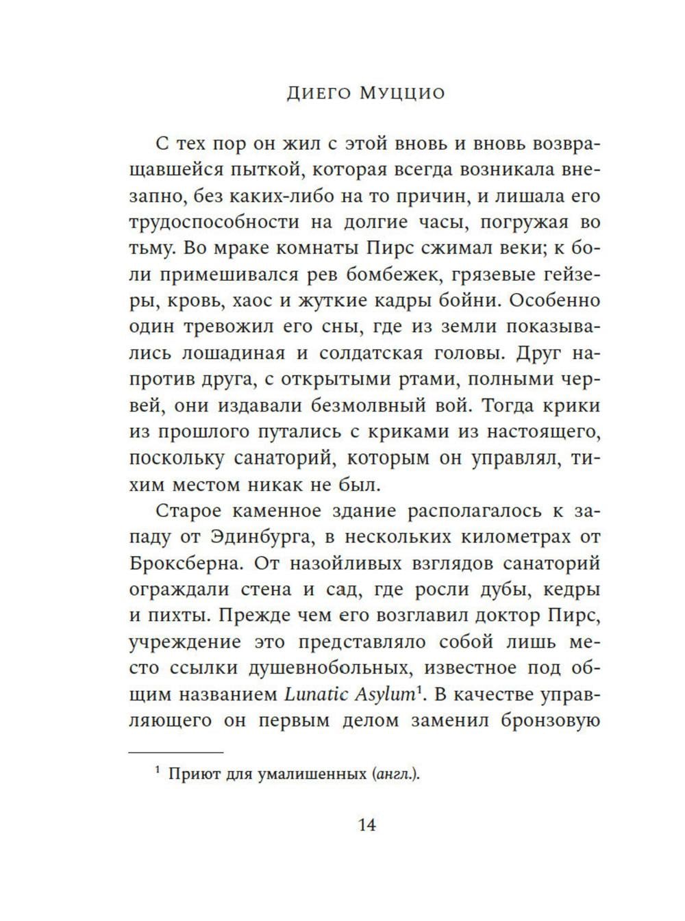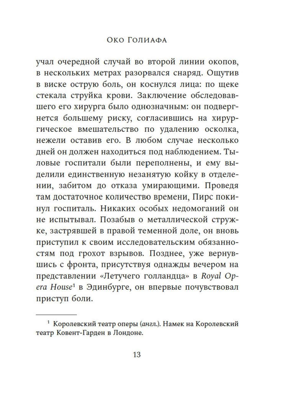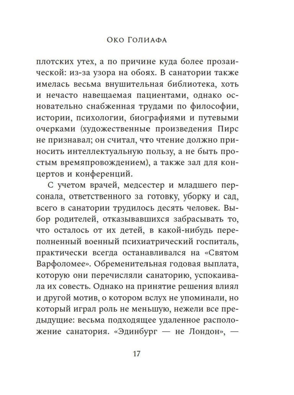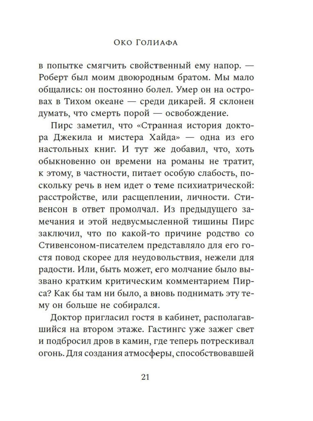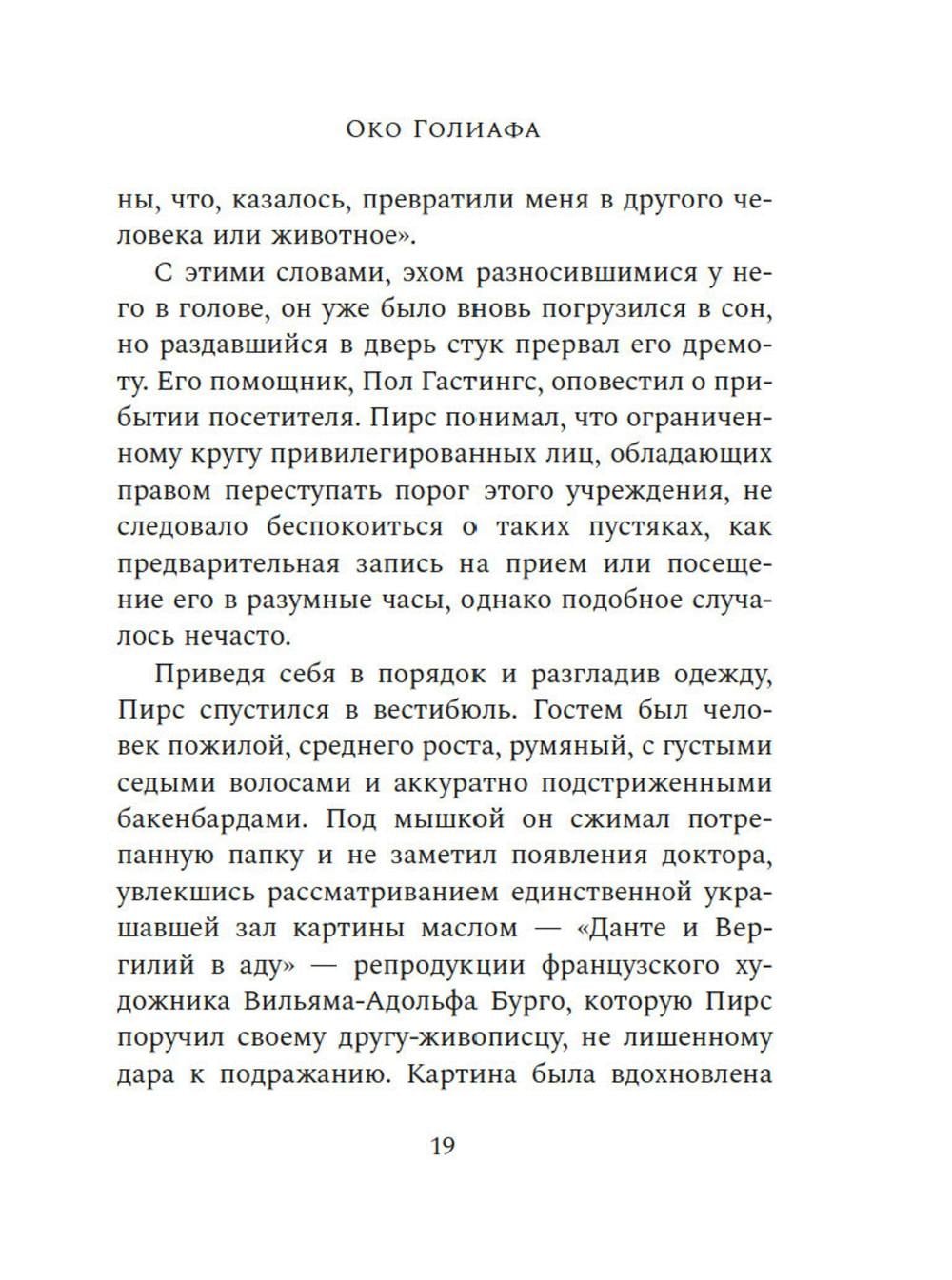СОДЕРЖИТ ИНФОРМАЦИЮ О НАРКОТИЧЕСКИХ ИЛИ ПСИХОТРОПНЫХ ВЕЩЕСТВАХ, УПОТРЕБЛЕНИЕ КОТОРЫХ ОПАСНО ДЛЯ ЗДОРОВЬЯ. ИХ НЕЗАКОННЫЙ ОБОРОТ ВЛЕЧЕТ УГОЛОВНУЮ ОТВЕТСТВЕННОСТЬ. Притягательный, сложно организованный, экспериментальный роман-лабиринт, написанный в лучших традициях американских классиков XX-го века. Действие «Ока Голиафа» разворачивается сразу после Первой мировой войны, разрушительной волной пронесшейся по миру. Роман повествует о психиатре и его пациенте, чудом выжившем, оставшись в одиночестве на маяке посреди жестокого, бушующего моря. В насильственной и жестокой связи, которая устанавливается между ними, стираются границы между здравомыслием и безумием, между добром и злом. Муццио создал роман, основанный на классических сюжетах и оригинальный по своей структуре, собрав в нем самые разные жанры: от травелога до исповеди. На страницах этой книги звучат отголоски Борхеса и Окампо, прослеживается сверхъестественная традиция Стивенсона и По, но при этом «Око Голиафа» остается глубоко психологическим произведением о сущности человека, природе жестокости и о том, какой отпечаток на нас накладывает война.| Издательство | Азбука |