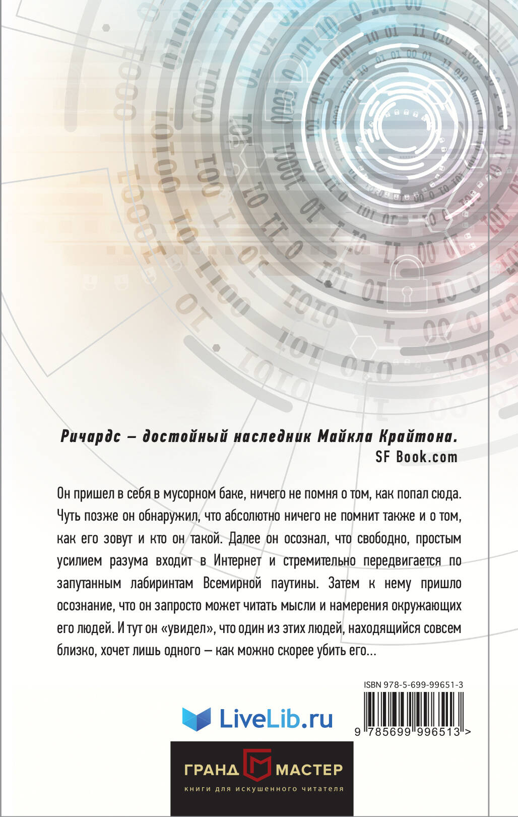 О книге Дело плохо - это было первое, что подумал Ник Холл, очнувшись в мусорном баке. Он не мог вспомнить о себе ничего, зато стал слышать странные голоса. Однако все оказалось еще хуже: по его пятам идет банда наемных убийц, а голоса в голове - это чужие мысли. Странные шрамы внушают ему мысль о том, что в его мозг вживили имплантаты, активировавшие пси-способности и возможность доступа в Интернет только силой мысли. И если б не они, Ник Холл был бы уже мертв. Читая мысли киллеров, вчерашний «ботаник», доктор биологии моря, находит выход из смертельных ловушек, но их череда кажется бесконечной. Все это напоминает кровавую партию в шахматы, когда с каждым ходом на поле становится одной пешкой или влиятельной фигурой меньше. Кто же тот невидимый гроссмейстер, что затеял эту игру? Для кого Для тех, кто не только ценит предельно напряженные остросюжетные триллеры, но не прочь поразмышлять и над общечеловеческими вопросами. Что будет, если наши мысли станут для других открытой книгой? Насколько общество готово к тому, что новые технологии могут и поднять человечество до невиданных высот, и обрушить его в бездну? Об авторе Дуглас Э. Ричардс - современный американский писатель. Окончил Университет штата Огайо по специальности «микробиология», Университет Висконсина по специальности «молекулярная биология», имеет степень магистра делового администрирования. Как автор научно-фантастических романов и технотриллеров дебютировал в 2004 году. Романы «Творец бога» и «Убийца бога» - бестселлеры по версии New York Times и USA Today. Также Ричардс - автор нескольких документальных проектов и научной фантастики для детей.| Издательство | ООО "Издательство "Эксмо" |