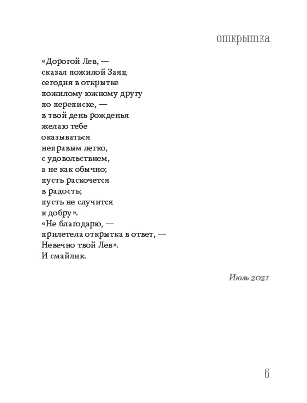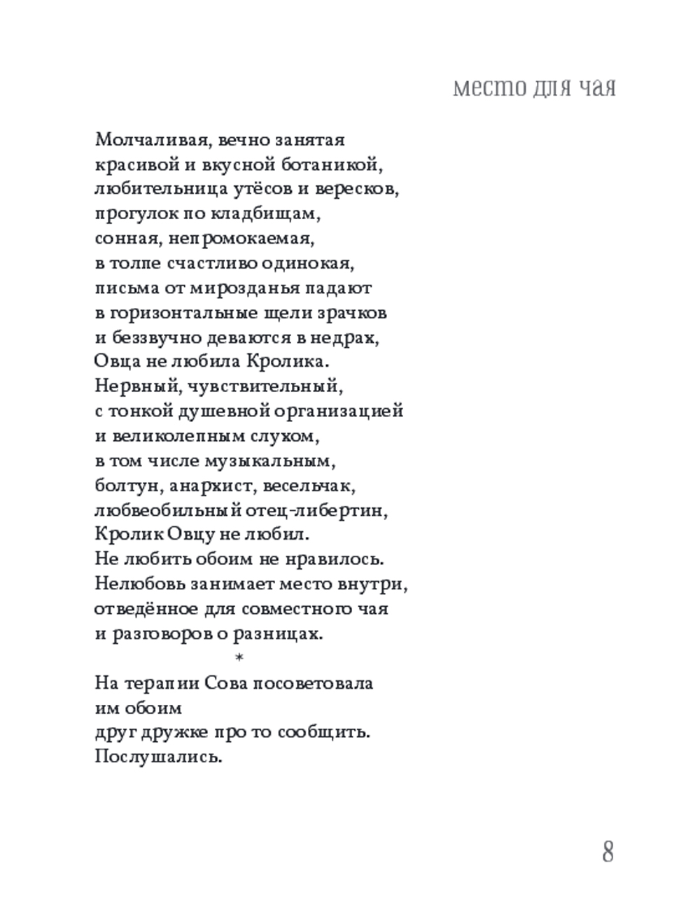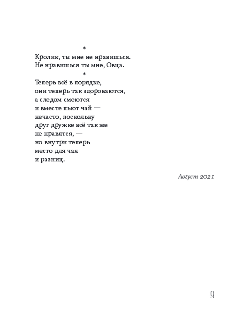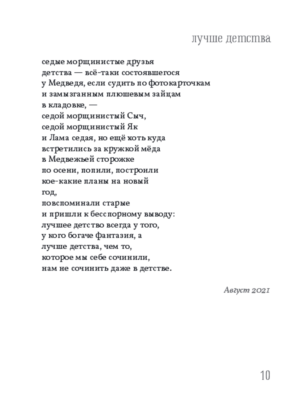 В пятый поэтический сборник переводчика, редактора и издателя Шаши Мартыновой вошли стихи, созданные в 2021-2023 годы. Читатель, знакомый с предыдущими книгами автора (Blue&Brown. A few suggestions / Синь&бурь. Некоторые соображения; Очень быстро об одном человеке; Большой риск одного человека; Один человек и другие возможности) встретит на этих страницах давних приятелей: одного человека, Медведя, Зайца и Сову, Овцу и Кролика, Павлика и Жорика - а также и совсем новых, незнакомых, без которых непонятно как мы раньше жили. Непонятно.| Издательство | Городец |