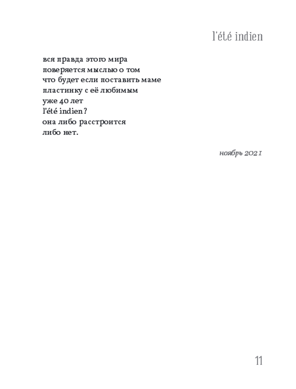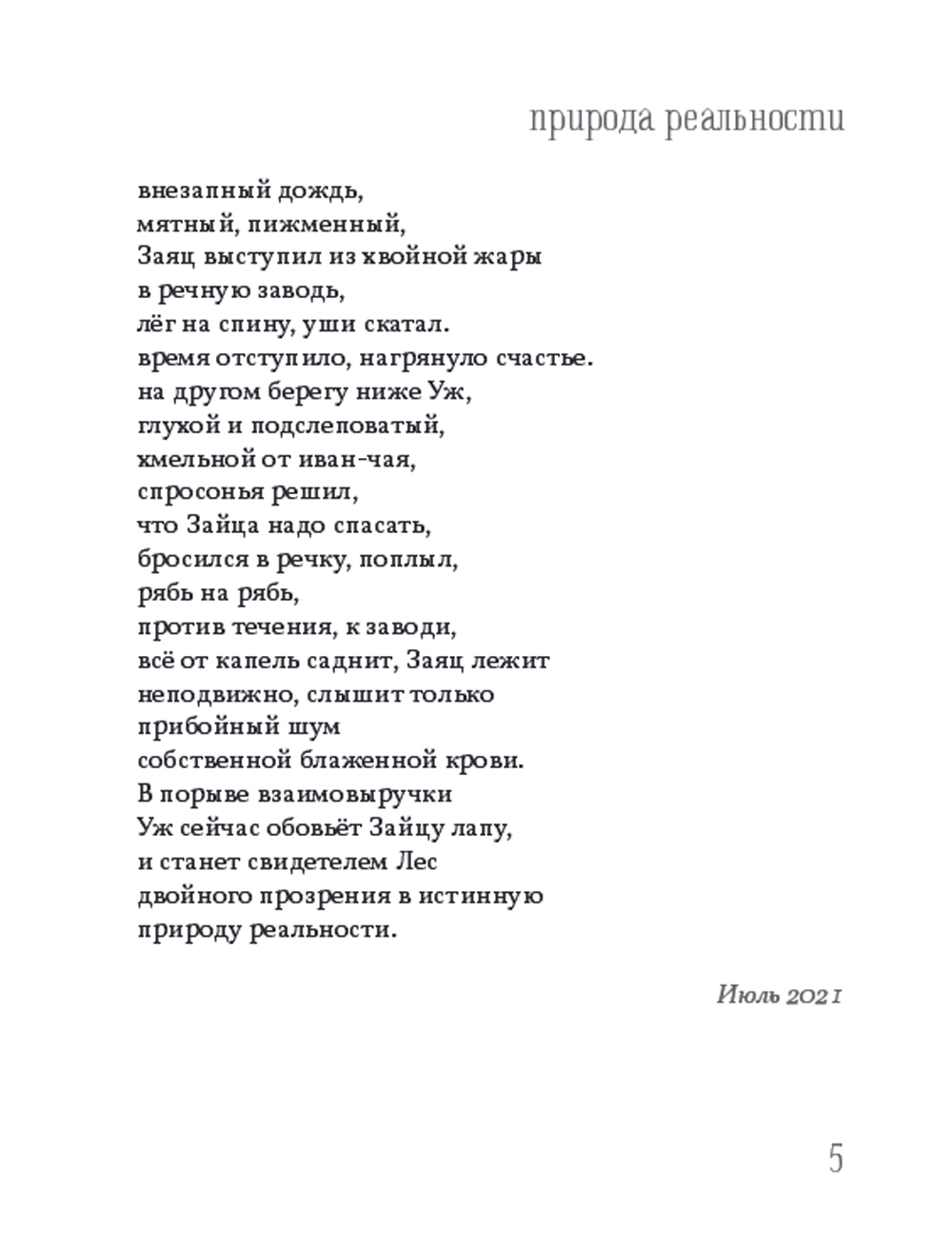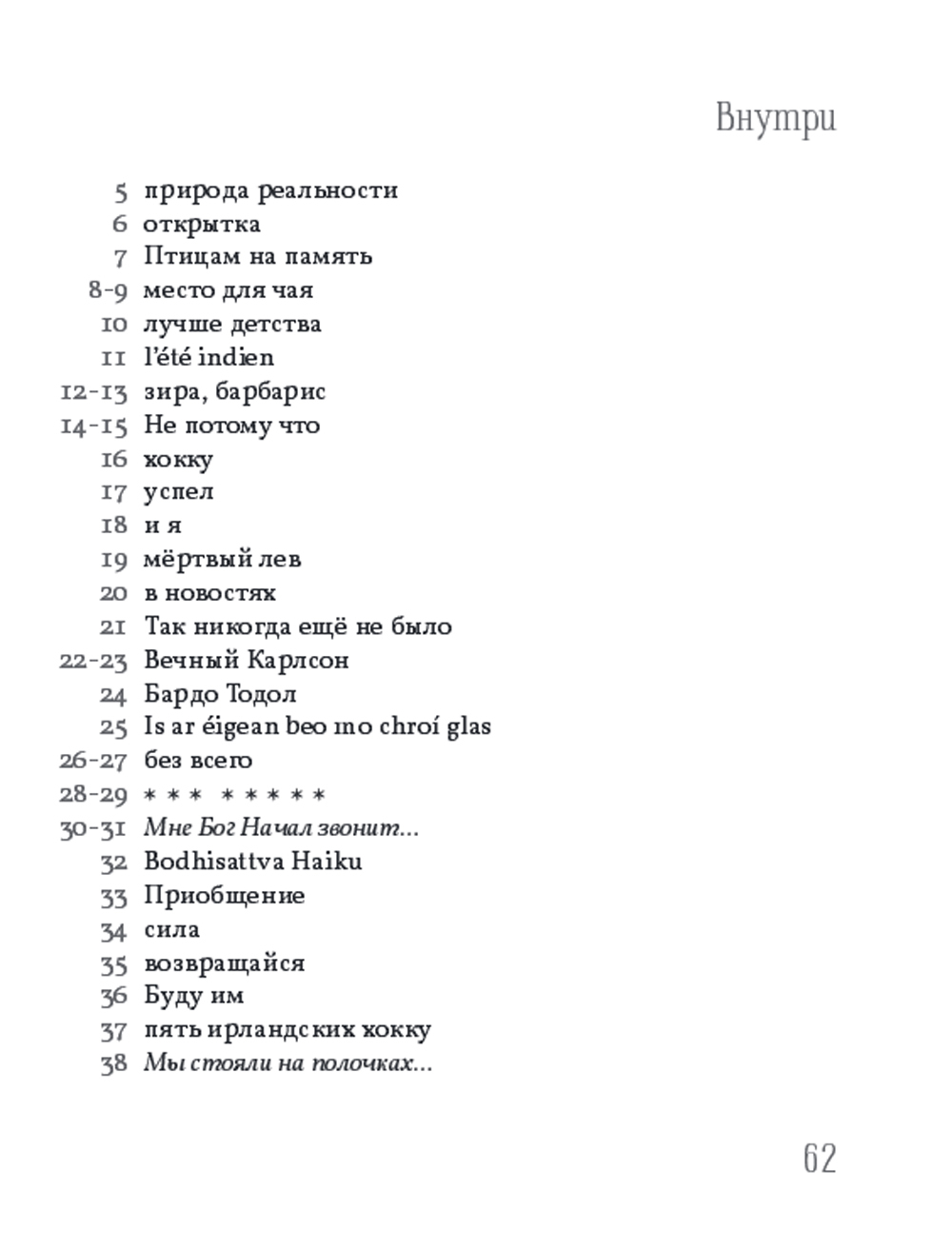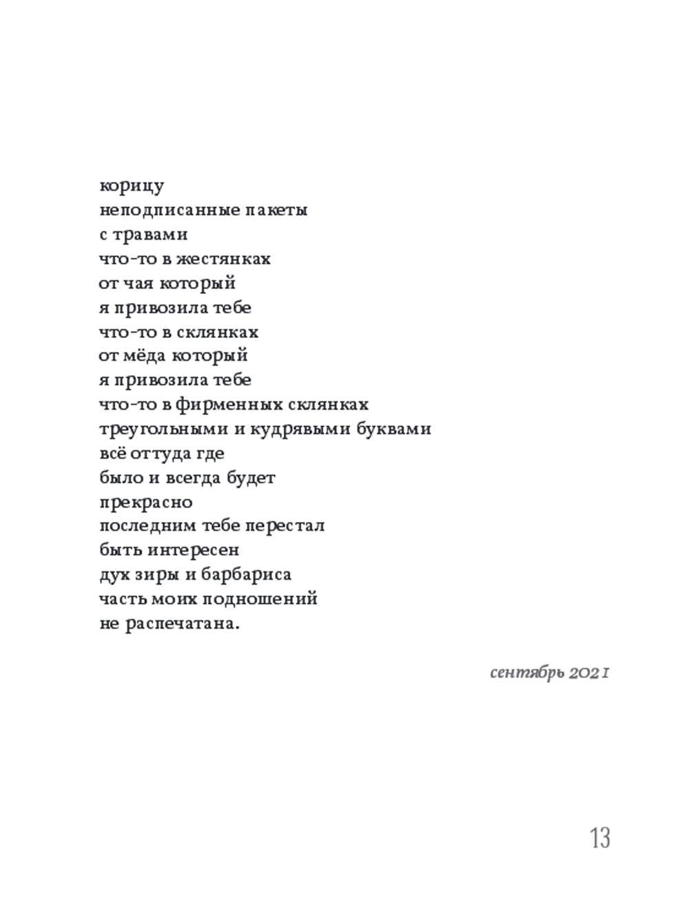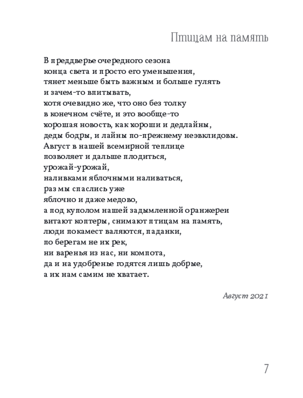 В пятый поэтический сборник переводчика, редактора и издателя Шаши Мартыновой вошли стихи, созданные в 2021-2023 годы. Читатель, знакомый с предыдущими книгами автора (Blue&Brown. A few suggestions / Синь&бурь. Некоторые соображения; Очень быстро об одном человеке; Большой риск одного человека; Один человек и другие возможности) встретит на этих страницах давних приятелей: одного человека, Медведя, Зайца и Сову, Овцу и Кролика, Павлика и Жорика - а также и совсем новых, незнакомых, без которых непонятно как мы раньше жили. Непонятно.| Издательство | Городец |