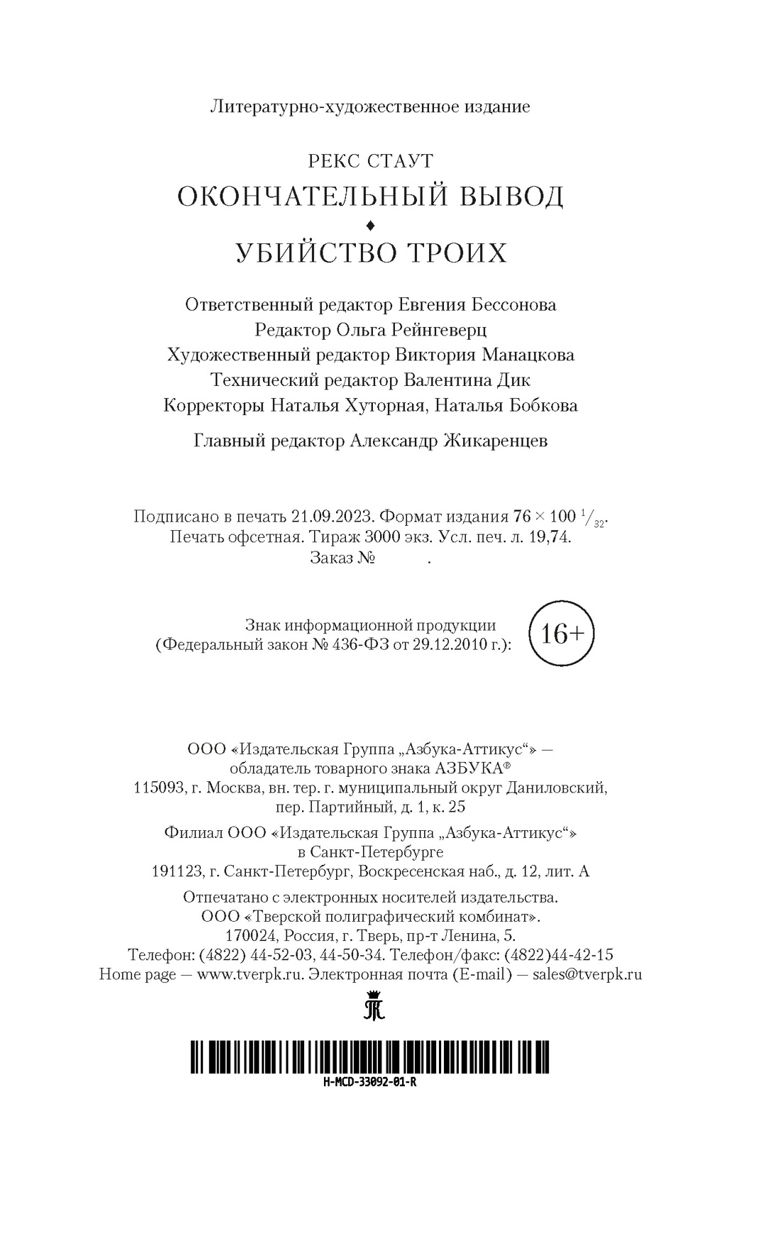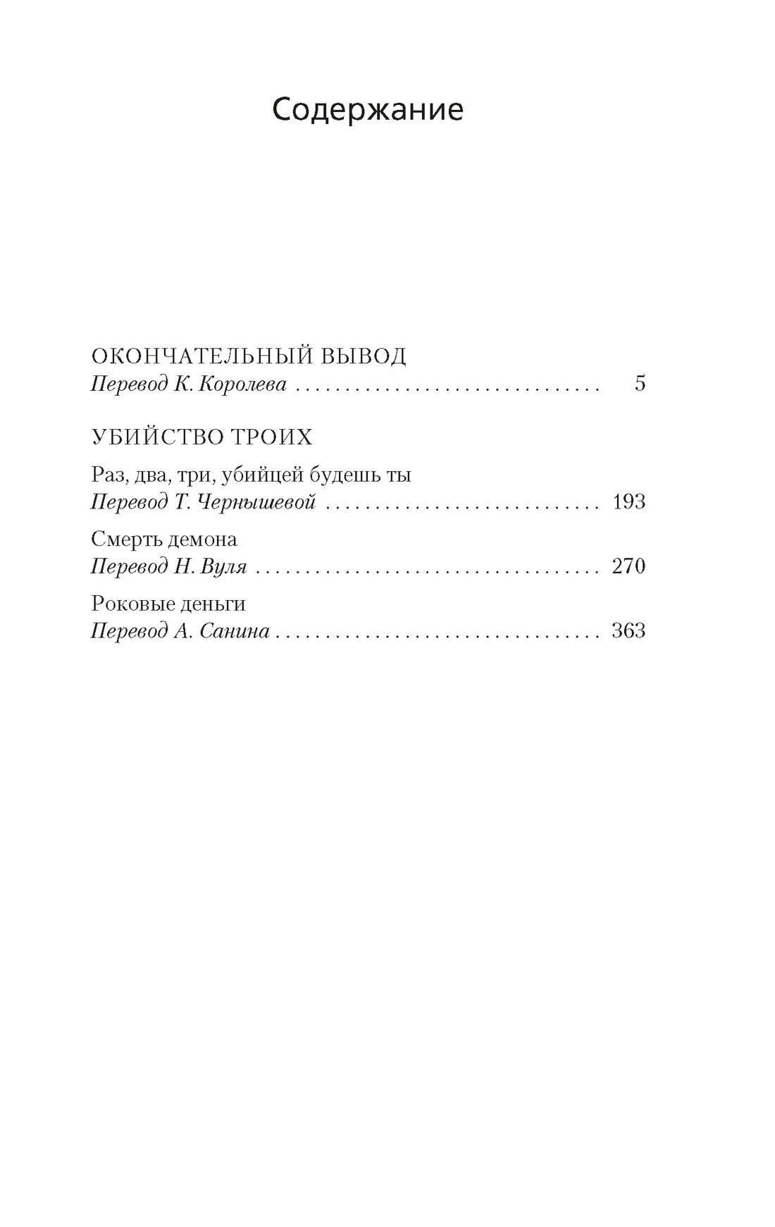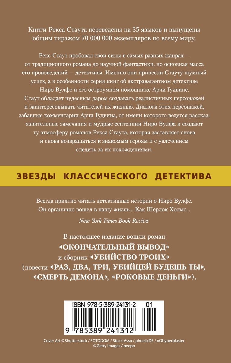 Ниро Вулф, страстный коллекционер орхидей, большой гурман, любитель пива и великий сыщик, практически никогда не выходит из дому. Все преступления он распутывает на основе тех фактов, которые собирает Арчи Гудвин, его обаятельный, ироничный помощник с отличной памятью. Благодаря знаменитому детективу похищенный муж миллионерши благополучно возвращается домой, но на следующий день его находят в домашней библиотеке придавленным статуей Бенджамина Франклина. Случайность или убийство?.. («Окончательный вывод»). Также в сборник включены повести, в которых к Вулфу приходят три посетительницы. Одну из них душат в кабинете сыщика его же галстуком, вторая признается, что пытается удержать себя от того, чтобы застрелить мужа, а третья, ярая ненавистница полиции, просит детектива изобличить фальшивомонетчиков.| Издательство | Азбука |