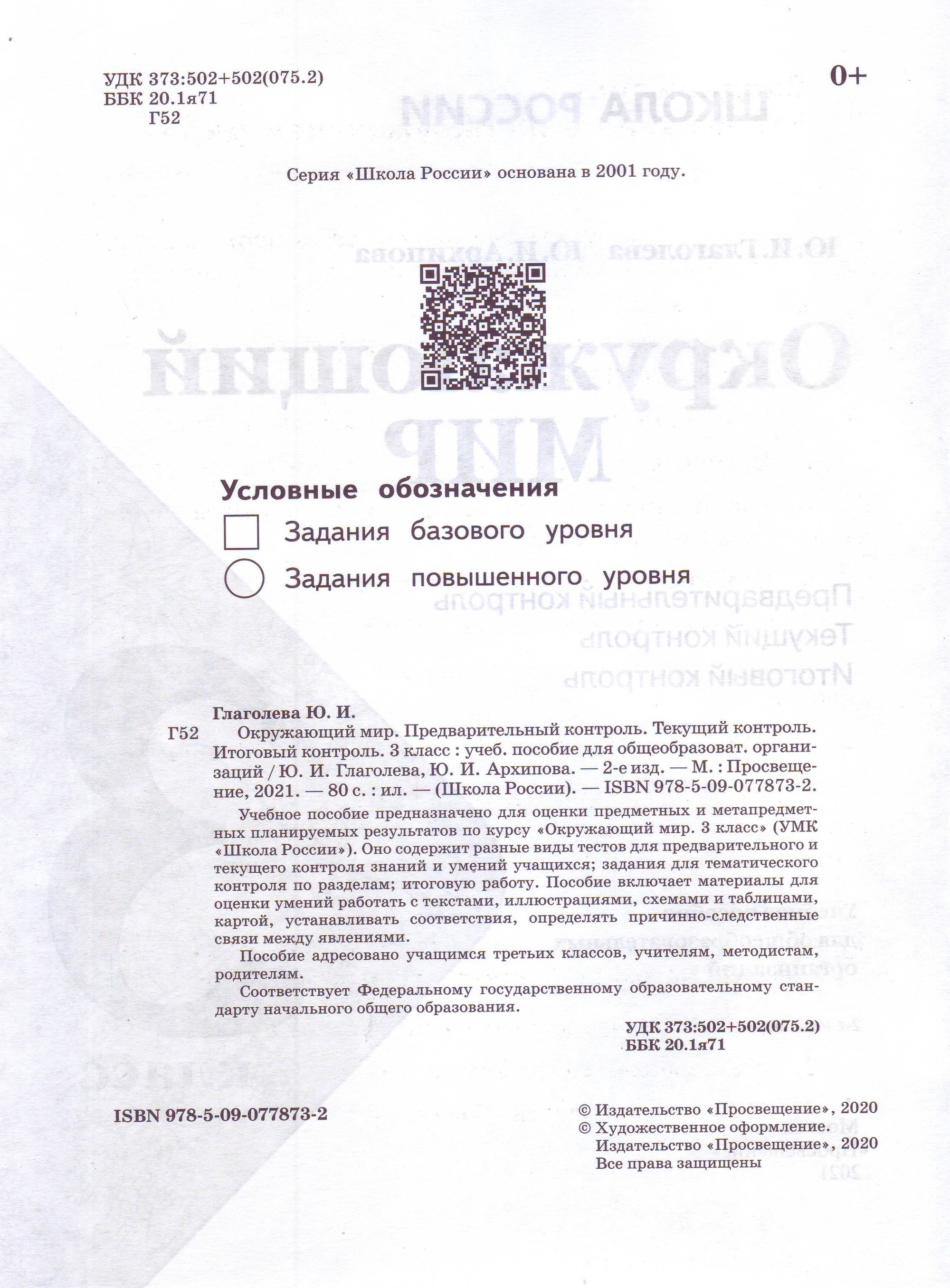Пособие предназначено для систематического контроля уровня достижения планируемых результатов по предмету «Окружающий мир» в третьем классе. Оценка планируемых результатов осуществляется на базовом и повышенном уровнях сложности благодаря дифференциации заданий в контрольно-измерительных материалах. Пособие предоставляет возможность корректировки индивидуальной траектории обучения ученика с учётом результатов входного, тематического и итогового контроля. Задачей пособия является также формирование самостоятельности в оценочной деятельности младших школьников с помощью материалов для прогностической оценки и самопроверки. Пособие предназначено для учащихся первого класса, родителей, самостоятельно занимающихся с детьми, и учителей начальных классов, работающих по системе «Школа России». Соответствует ФГОС начального общего образования.