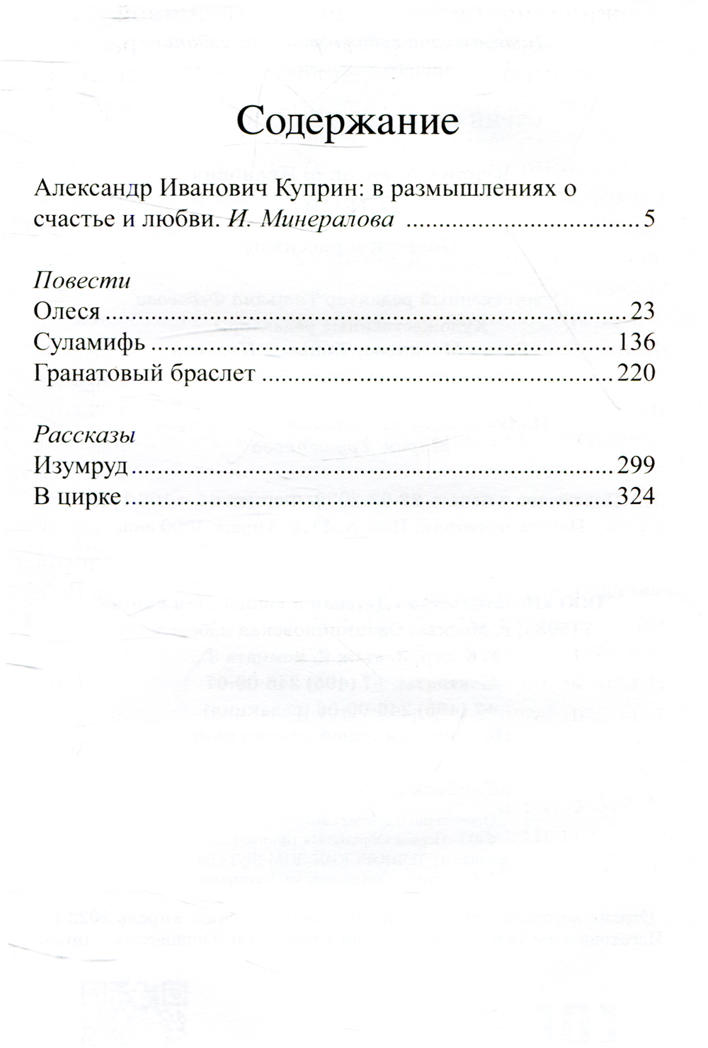 В книгу вошли три повести: «Олеся», «Суламифь», «Гранатовый браслет». В них раскрыта одна из основных тем в творчестве русского писателя Александра Ивановича Куприна - тема любви, хрупкой и безответной, страстной и ревнивой, но всегда самоотверженной и трагической.