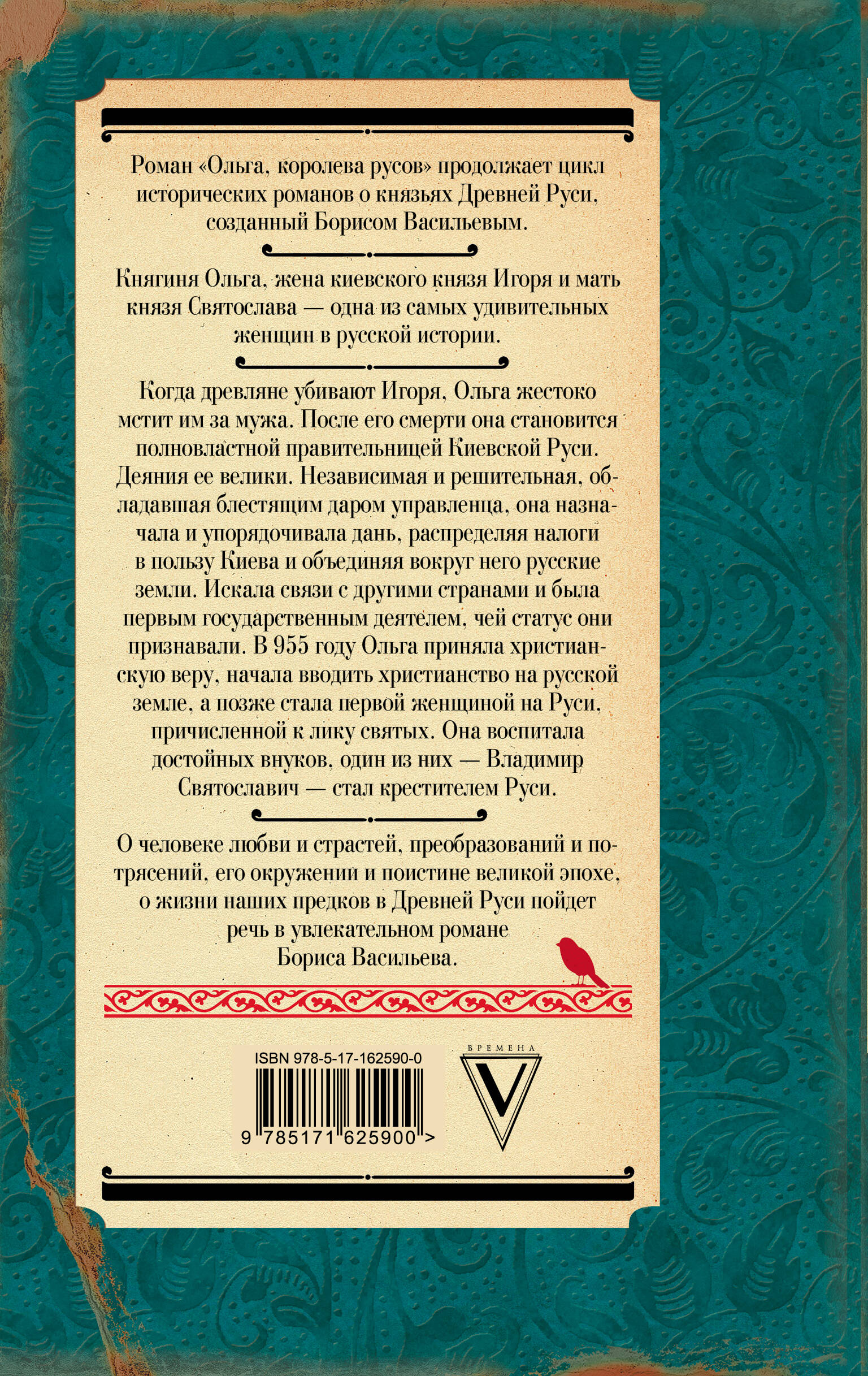 Роман "Ольга, королева русов" продолжает цикл исторических романов о князьях Древней Руси, созданный Борисом Васильевым. Княгиня Ольга, жена киевского князя Игоря и мать князя Святослава - одна из самых удивительных женщин в русской истории. Когда древляне убивают Игоря, Ольга жестоко мстит им за мужа. После его смерти она становится полновластной правительницей Киевской Руси. Деяния ее велики. Независимая и решительная, обладавшая блестящим даром управленца, она назначала и упорядочивала дань, распределяя налоги в пользу Киева и объединяя вокруг него русские земли. Искала связи с другими странами и была первым государственным деятелем, чей статус они признавали. В 955 году Ольга приняла христианскую веру, начала вводить христианство на русской земле, а позже стала первой женщиной на Руси, причисленной к лику святых. Она воспитала достойных внуков, один из них - Владимир Святославич - стал крестителем Руси. О человеке любви и страстей, преобразований и потрясений, его окружении и поистине великой эпохе, о жизни наших предков в Древней Руси пойдет речь в увлекательном романе Бориса Васильева.