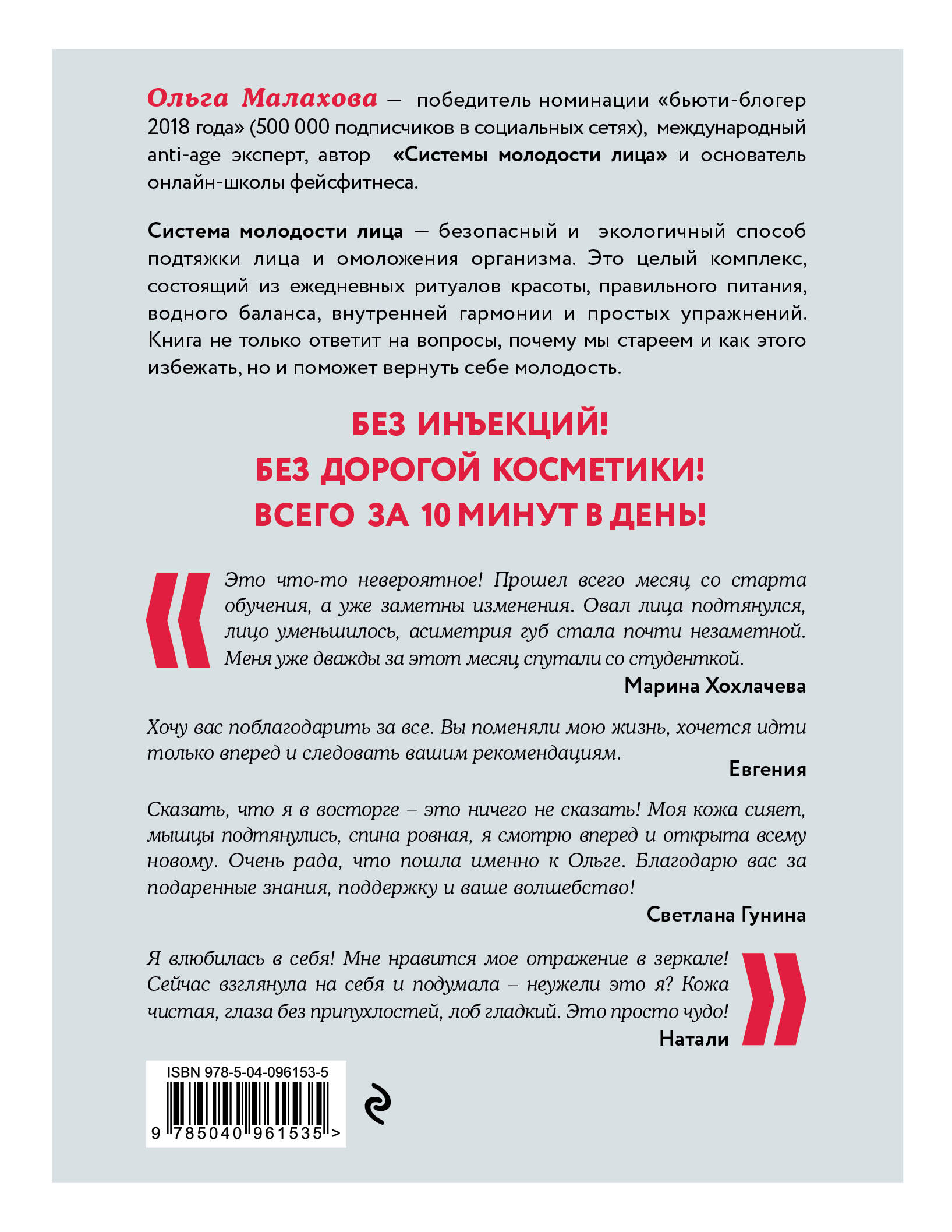 Как сохранить молодость в 25-30 лет и как вернуть в 45-55? Без инъекций! Без дорогих кремов! Всего за 10 минут в день! И главное - своими руками! Комплекс упражнений для лица от известного блогера Ольги Малаховой поможет вам каждый день получать комплименты. Следуя советам книги, вы сможете заниматься где угодно: у зеркала в ванной комнате, в автомобильных пробках, на пляже, в бане и даже в постели. Только представьте: вы просыпаетесь утром, подходите к зеркалу и… не видите привычной отечности, нависших век, "гусиных лапок", второго подбородка. Вы полюбите свое отражение в зеркале!| Издательство | ООО "Издательство "Эксмо" |