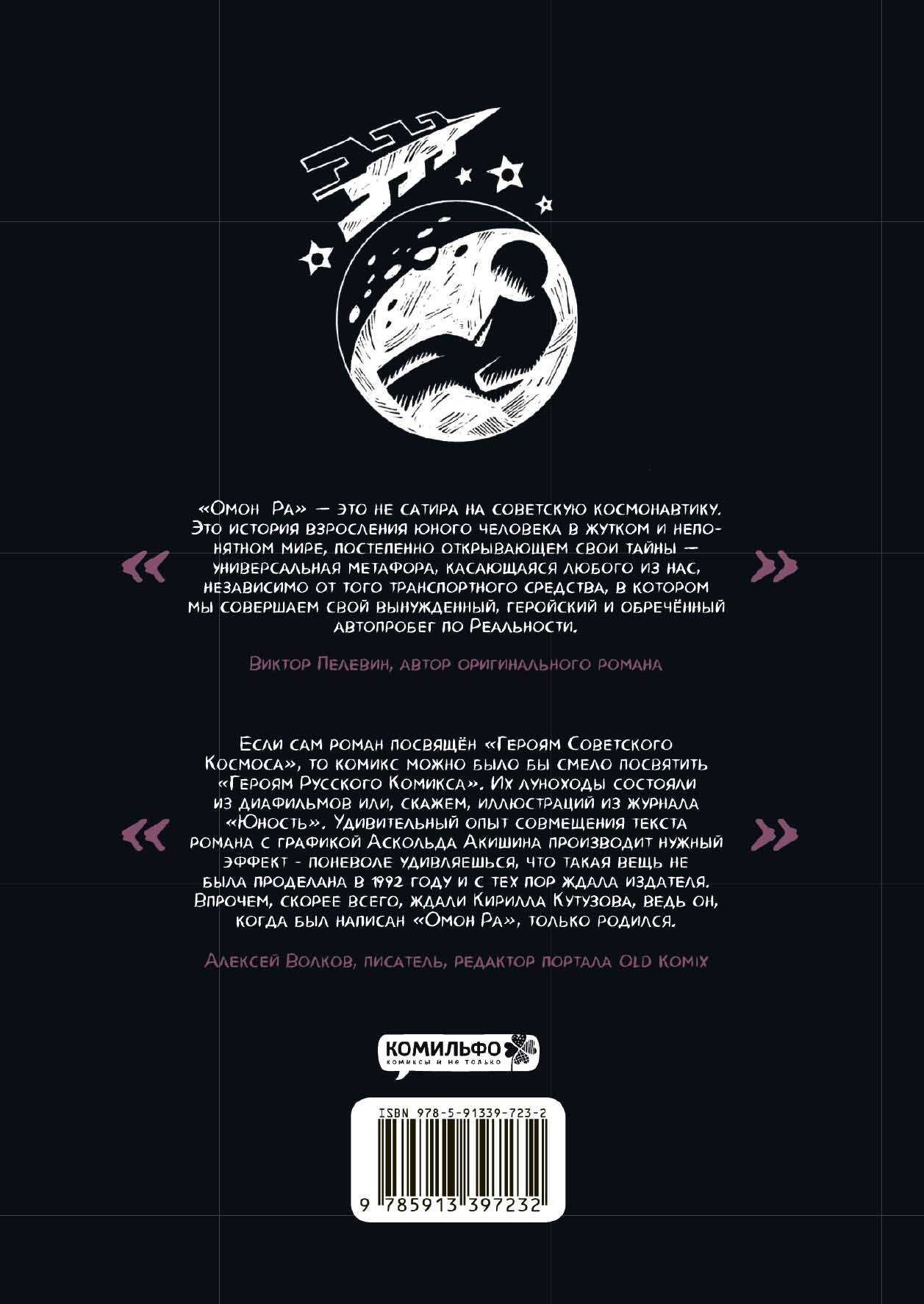 Графическая адаптация культового романа Виктора Пелевина, выполненная мэтром отечественного графического романа Аскольдом Акишиным и знатоком комиксов Кириллом Кутузовым, отправит нас прямо в советское прошлое, в котором вся страна грезила полётами в далёкий космос, а каждый первый мальчишка мечтал стать космонавтом. Главный герой Омон решил не останавливаться на мечтах и поступил в лётное училище имени Маресьева, а там... Там реальность переплетается с мифом, героя окружают видения и химеры, вопреки которым человек с именем Омон и позывным Ра должен покорить космос...| Издательство | Комильфо ООО |